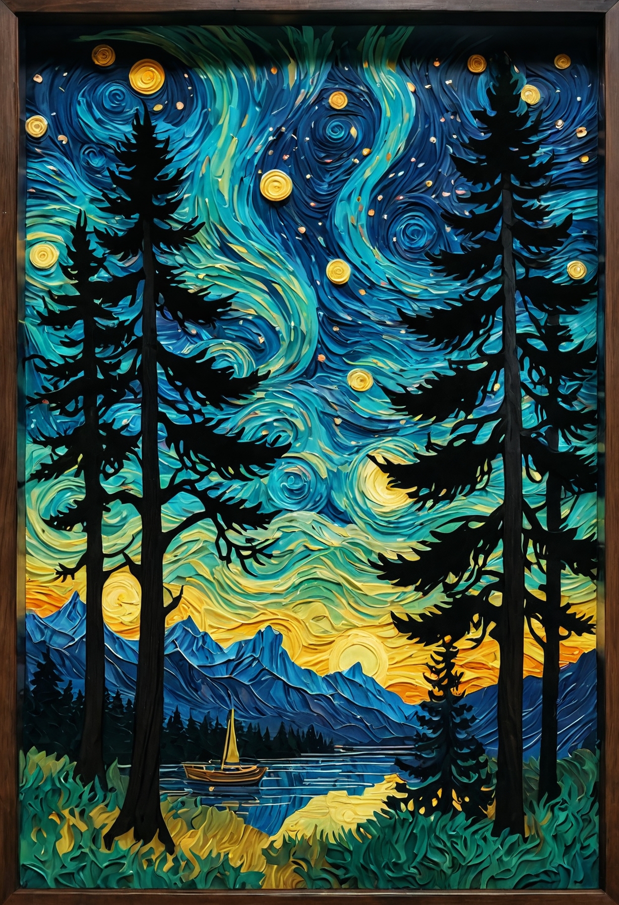 3D papercut shadow box of A living Van Gogh painting, swirling stars and cypress trees morphing into 3D, thick oil brushstrokes moving like liquid, photorealistic textures mixed with impressionism, 8k museum masterpiece . Layered, dimensional, depth, silhouette, shadow, papercut, handmade, high contrast