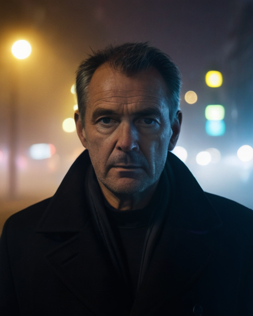 city street, neon, fog, volumetric, closeup photo of 50 y.o man in dark clothes, serious face