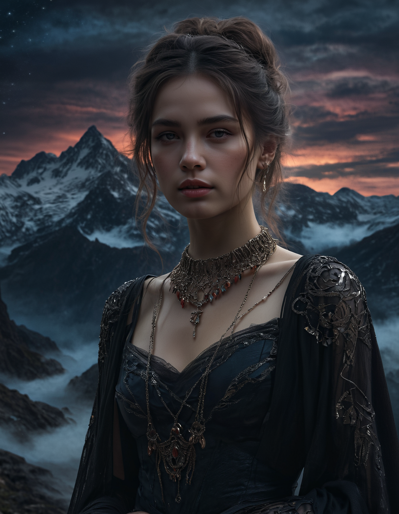 Gothic style a colorful abstract painting with a mountain in the background and a sky filled with clouds and stars in the middle,a detailed matte painting,dark art,<lora:Abstract Concept-glowing:0.4>,concept art,glowing,,concept art,glowing,Android Jones,, a woman with a necklace and a necklace around her neck and face,<lora:CB-Fantasy-000008:1>, Charlie Bowater, trending on art station, a character portrait, . Dark, mysterious, haunting, dramatic, ornate, detailed