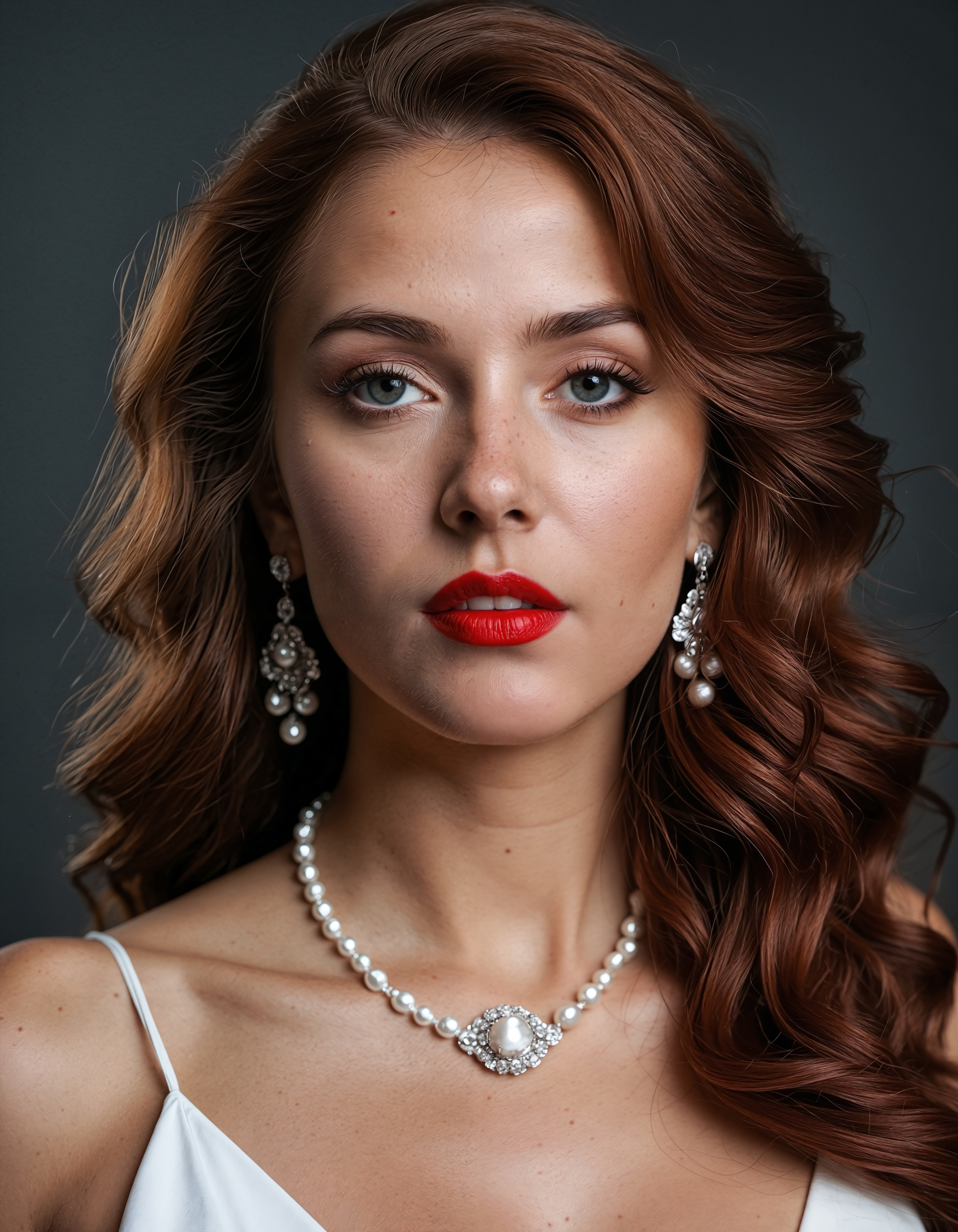 analogue photo of a beautiful 25 years old woman, high resolution image, (auburn hair Viking woman), A photo-realistic portrait shoot from a portrait camera angle about a woman with long, wavy hair and striking makeup, wearing a white dress with a plunging neckline, a pearl necklace, and red lipstick. on the middle of the image, a 1 woman, who appears to be in her early twenties, with detailed skin, realistic eyes, and a sultry expression, is looking directly at the viewer. she has long, curly hair that falls down her back, and her hair is styled in a way that frames her face. her eyes are accentuated by dramatic makeup, with bold red lipstick and dramatic eye makeup. her lips are painted red, and she has a mole on her cheek. she is wearing a pearl choker and earrings, adding a touch of elegance to her elegant appearance. the background is dark and minimalistic, with a hint of a window on the left, allowing soft lighting to filter in and create a sensual atmosphere.