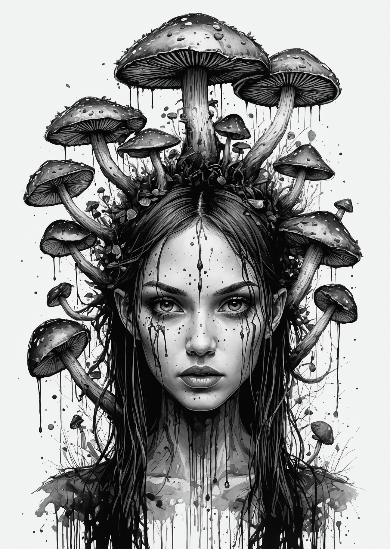 VibrantlySharp style, animeniji, 3pic_vist4, An eldritch girl crowned in toadstools, her face half-submerged in ink, with clusters of toxic red mushrooms emerging like tumors, each stalk veined and pulsing, her expression solemn, eyes wide and ancient, lost in the fog of a fungal dream, dripping spores blurring the edges of her fading humanity. <lora:Mushroom_Portrait_Flux_v1:1> boshroomworld <lora:SketchStyle:1> Jedsk5tch, sketch, black and white <lora:DarkAnimeArt_V1:1> dark line art