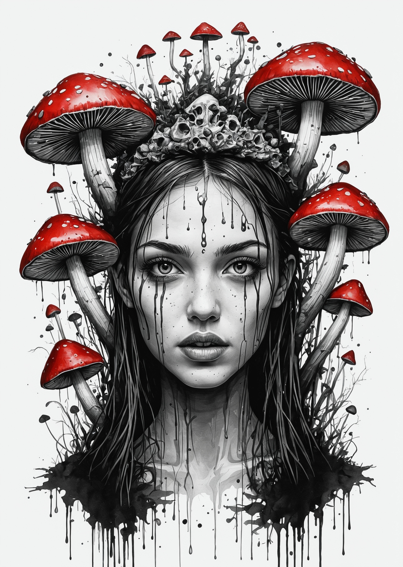 VibrantlySharp style, animeniji, 3pic_vist4, An eldritch girl crowned in toadstools, her face half-submerged in ink, with clusters of toxic red mushrooms emerging like tumors, each stalk veined and pulsing, her expression solemn, eyes wide and ancient, lost in the fog of a fungal dream, dripping spores blurring the edges of her fading humanity. <lora:Mushroom_Portrait_Flux_v1:1> boshroomworld <lora:DarkAnimeArt_V1:1> dark line art <lora:SketchStyle:1> Jedsk5tch, sketch, black and white