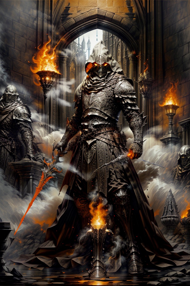 score_9, score_8_up, 8, score_7_up, solo, fantasy style, masterpiece, 8k, BREAK Medieval fantasy warrior in ornate forged steel plate armor, wearing distinctive metal mask with intricate engravings, standing in ancient stone forge hall with glowing embers. Character holds masterwork sword and wears flowing dark cloak. Background shows hammer and anvil, weapon racks, stone archways. Dramatic lighting from forge fire creates shadows and highlights on polished armor. Art style: official Dungeons and Dragons book illustration, fantasy art, digital painting, detailed shading, muted color palette with warm orange forge glow, professional RPG artwork, similar to Player's Handbook illustrations. High detail on armor craftsmanship, mask design, and medieval smithing tools. Atmospheric smoke and sparks from forge. Full body composition showing warrior's imposing stance. Professional fantasy game art quality, painted illustration style, not photorealistic. BREAK oil painting, BadDream, negative_hand, NEG_EMBED_STABLE_YOGI_V3, FastNegativeV2, AissistV2 (detailed:1.3), (sharp focus:1.1), medieval style, (expressive face:1.2),,