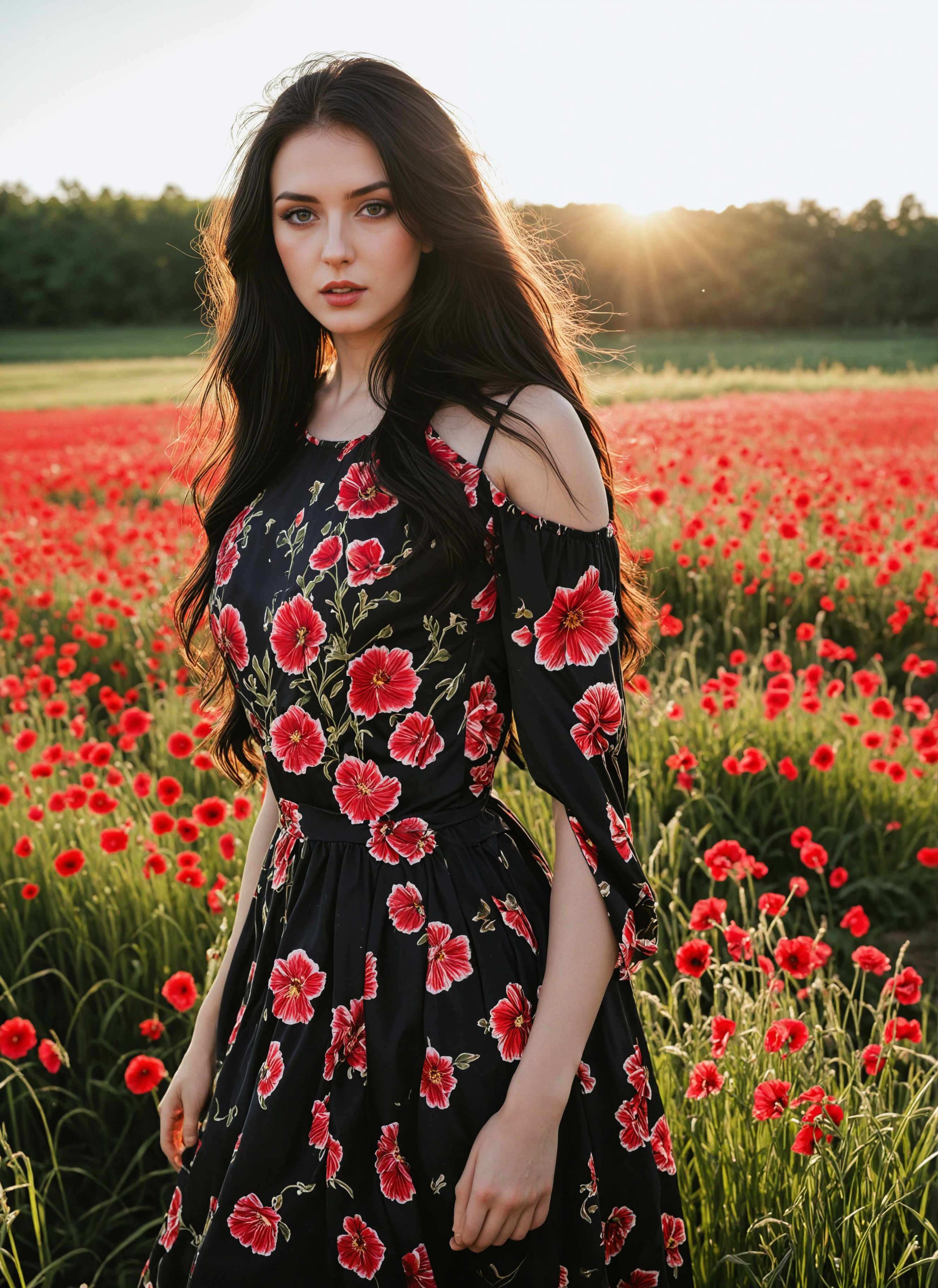 breathtaking detailed, masterpiece, absurdres, awe-inspiring, best quality, vibrant colors, beautiful girl, large expressive eyes, long flowing black hair adorned with red flowers, standing in a vibrant summer flower field, wearing a flowing black summer dress,, calm and curious expression, slight tilt of the head, BREAK, warm golden sunlight from upper right creating soft glow and highlights on hair and shoulders, long shadows on the dress and grass, backlit with a dreamy halo effect, subtle light scattering through petals, BREAK, medium-full shot, camera angle slightly below eye level for a majestic perspective, high dynamic range, cinematic style, painted texture, ultra-detailed, golden hour ambiance<lora:sdxl_Brenna_SDXL.safetensors:0.7000000000000001:0.7000000000000001>