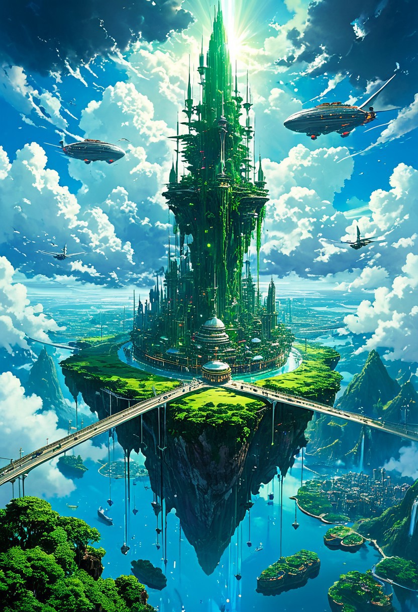 Image is a digital artwork, Floating Islands in the Sky "Envision an awe-inspiring floating city suspended amidst the clouds, where lush green landscapes rest atop gigantic floating islands connected by sleek, futuristic bridges. Below the floating behemoths, vast stretches of crystalline rivers cut through the verdant earth. Towering spires rise from each island, shrouded in mist, their bases held up by massive chains that stretch into the heavens. The city glows with an ethereal beauty, as natural and mechanical elements intertwine to create a paradise that hovers gently above the world. The sky is vibrant with swirling clouds, as airships and flying vehicles dart between the islands.",cyberpunk. (Studio Ghibli)