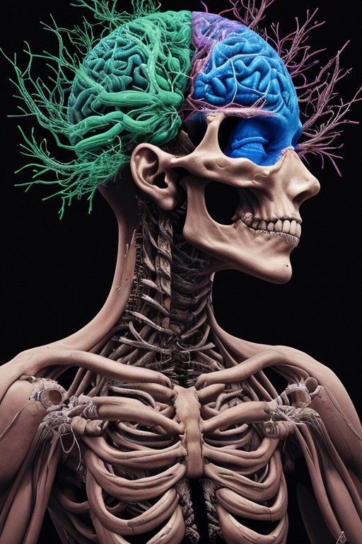 A man drowning inside his own mind. FRONT VIEW. Subliminal messaging, Horror, neon-colored brain scan aesthetic on black background. the figure of a skull is seen inside the brain scan. Psychedelic brain scan. Horror, Vibrant, glowing neural pathways Abstract, futuristic aesthetic. Style mimics bioluminescence art. Sharp contrast between vivid colors and deep black background. realistic rendering of brain lobe. Conveys sense of brain death, cognitive decline, and mental degradation. Sharp jagged teeth. Horror theme.