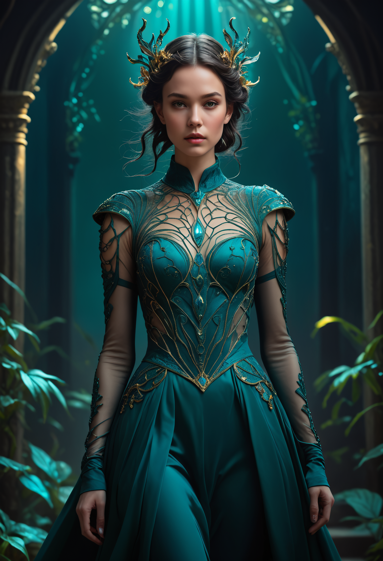 ethereal fantasy concept art of Roku WildCards/Dreamshaper Quality, <lora:Alexander McQueen-art nouveau fashion embroidered:1>,Alexander McQueen,art nouveau,fashion embroidered,<lora:Abstract Concept-1girl:0.8>,concept art,1girl,<lora:LetThereBeLight:0.2>,Beeple,dark teal lighting, . magnificent, celestial, ethereal, painterly, epic, majestic, magical, fantasy art, cover art, dreamy