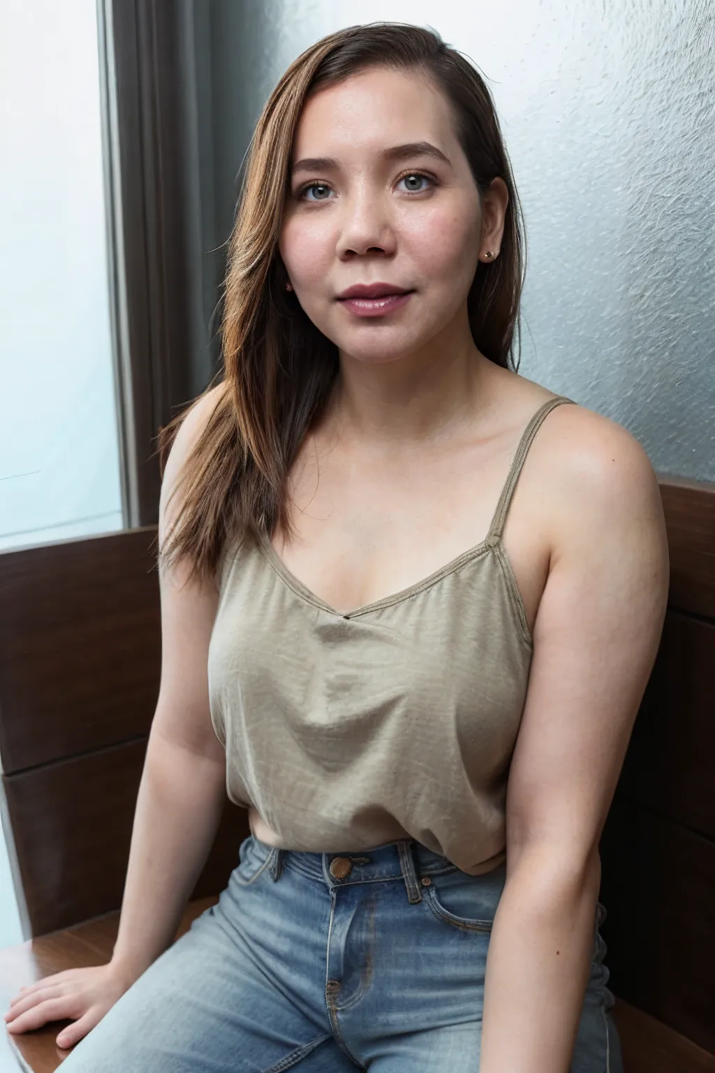 a photo of a 1girl,Vherna-500, half body shot, wearing jeans and tank top , natural eyes, natural hands, detailed, posing in a coffee bar <lora:Hand v3 SD1.5:0.75> <lora:polyhedron_all_eyes:0.35>