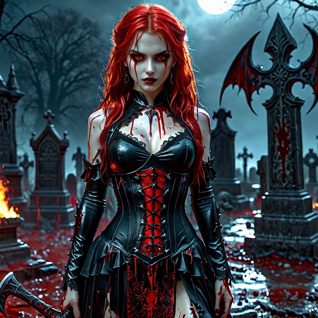High resolution ultra-realistic of sinister High resolution Beautiful Warrior vampire girl, ultra-realistic body, perfect athletic body, artgem, WLOP, (Intricately designed tight lace black and red gothic dress: 1.5), standing in a sinister dark fantasy graveyard, fighting pose, beautiful Warrior vampire girl, fire, defiant and seductive, covered in dirt and blood, blood-smeared, cinematic colors Lighting, extremely detailed, 8K, wavy red hair, realistic dirty bloody face, realistic red eyes, Attractive girl, beautiful Warrior vampire girl on in cool dark fantasy outfit, hyper-detailed, hyper-realistic, Attractive 21 old years girl, perfect athletic figure, Intricately designed handsome vampire pale bloody face, beautiful perfect detailed pupils, wet oily shiny skin, Dark Ages elements, intricate, smooth, sharp focus digital painting, Asymmetrical Balance, hyperdetailed painting, dynamic lighting, adding to the intense and dynamic atmosphere of the scene, complex masterpiece
