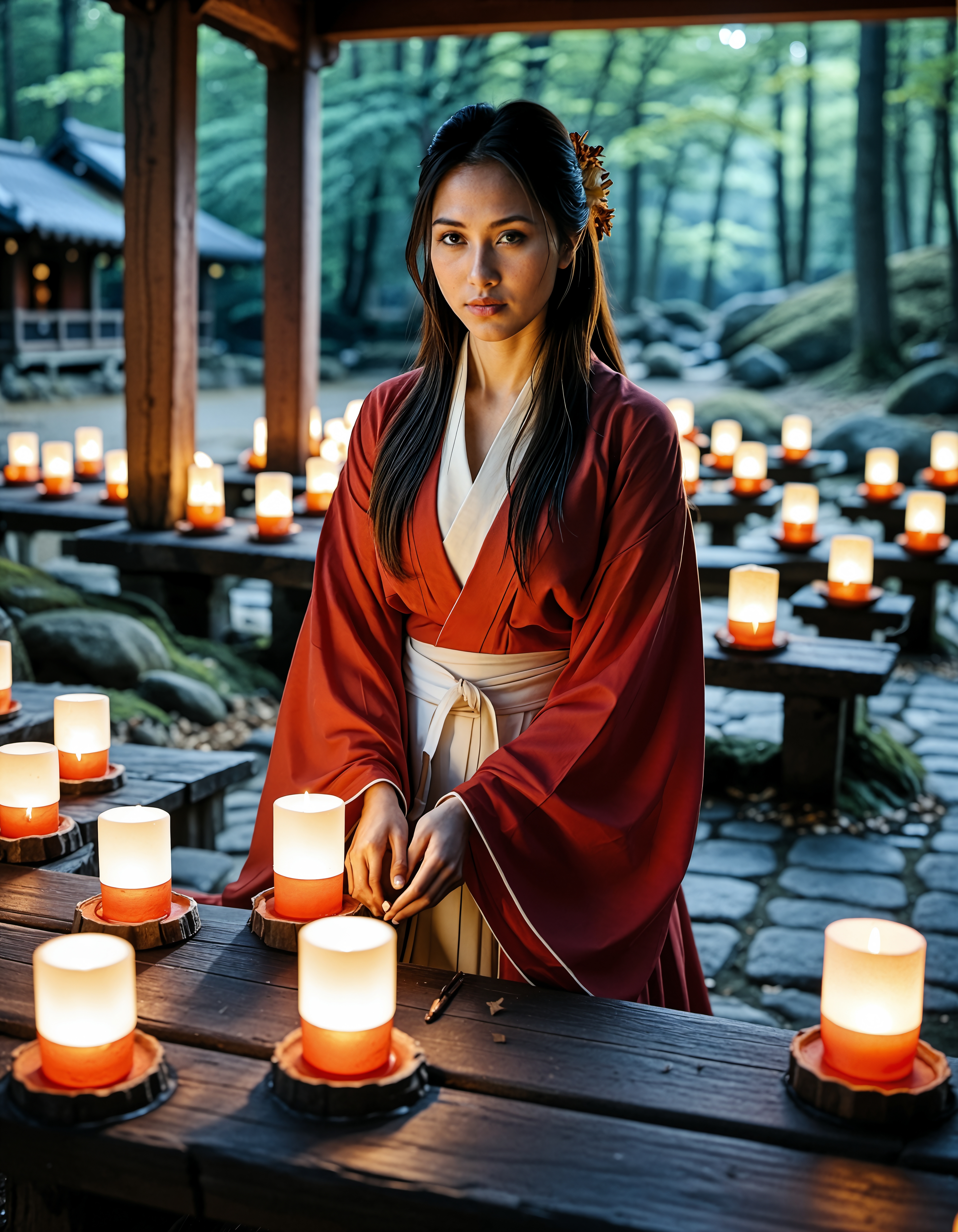 Realistic image of a beautiful woman, Asian woman, dark hair, <lora:Ai_Lotus:0.75>,,<lora:muromachi86:0.6>, Candlelit autumn shrine: a white-and-red-robed shrine maiden lighting lanterns along a mossy stone path, swirling amber leaves, flickering candles creating dancing shadows on ancient wood beams, 35 mm f/2, low-light high ISO with natural film grain. ,photo Fantasy art combining the styles of Boris Vellejo and Luis Royo, Photorealistic, real photo, god rays, 1girl, 21yo,realistic, ,Sexy pose, erotic pose, exhibitionism, ,hot air balloon festival