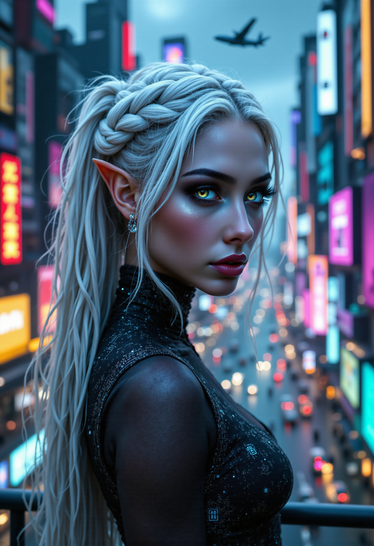 Masterpiece, best quality, ultra-detailed photorealistic portrait of a stunningly beautiful young woman with delicate elven ears and flawless porcelain skin. Her long, silver-white hair is styled in an intricate braid, with loose strands catching the light and shimmering with iridescent pink and blue highlights. She has heterochromia, one eye a luminous gold and the other a deep sapphire blue, both are extremely detailed with an intricate iris and a perfect reflection of the city lights. She has a serene, enigmatic expression, looking slightly away from the camera as glistening raindrops cling to her skin and long eyelashes. She wears a form-fitting black bodysuit made of a material resembling polished obsidian, adorned with intricate, glowing cyan filigree patterns that look like circuits. A translucent, ethereal organza shawl is draped over her shoulders. She stands on a high-tech balcony overlooking a sprawling, neon-drenched cyberpunk cityscape at night. The background is filled with towering skyscrapers, holographic advertisements, and flying vehicles, all softened with beautiful bokeh. The scene is lit by a combination of dramatic, volumetric neon light from below and soft moonlight from above, creating sharp rim lighting on her hair and shoulders. Cinematic lighting, sharp focus, insane details, 8k resolution.