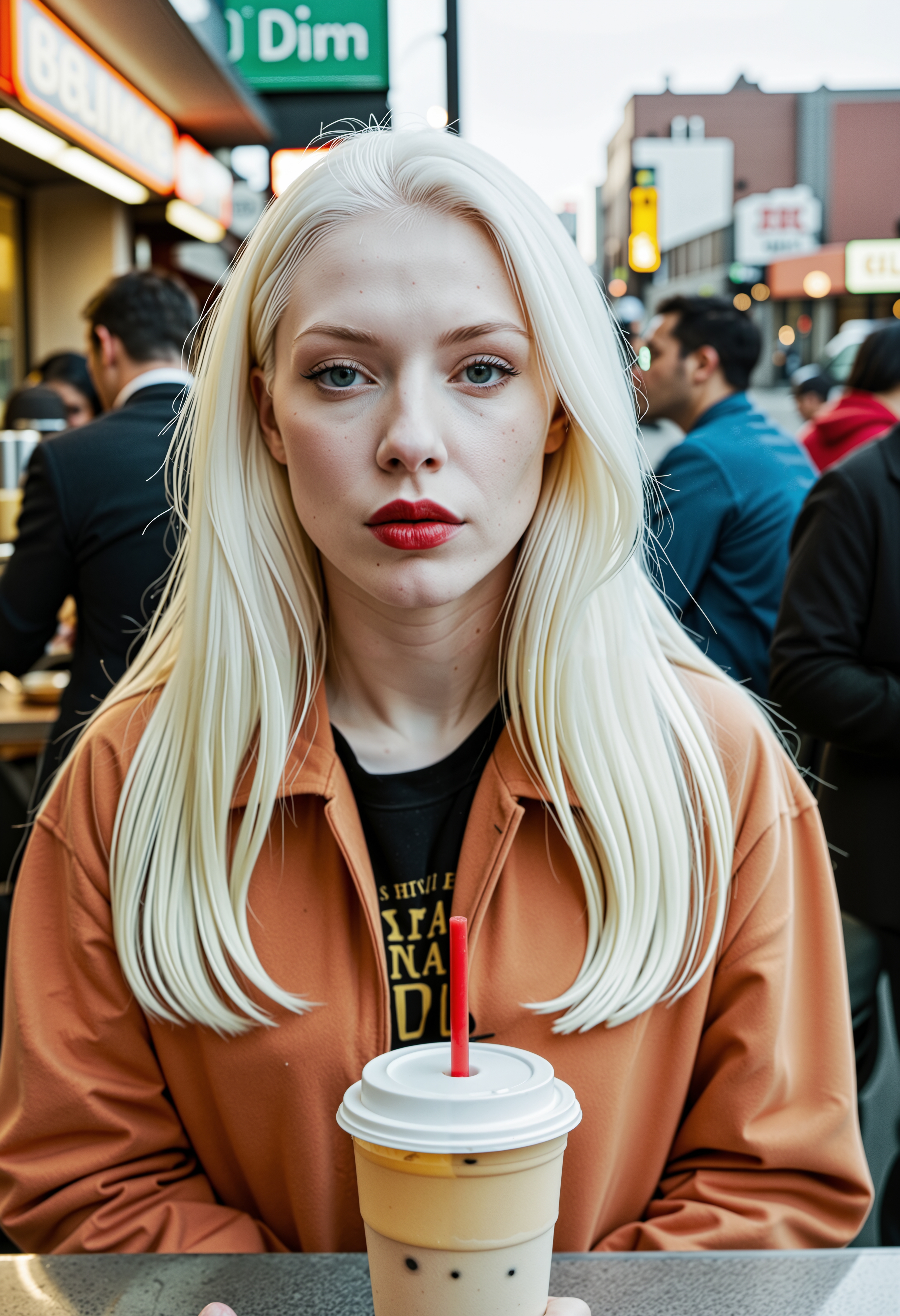 close up analogue photo of a beautiful 25 years (((albino woman:1.5))) with white hair (((pale skin:1.5))), white hair, <lora:Lumiya_SDXL:0.6>, Wearing a sunset-orange hoodie under a tailored plaid coat, paired with black leggings and suede ankle boots, a woman sips bubble tea outside a retro diner as taxis zoom by in blurred motion, city dusk just beginning to fall.