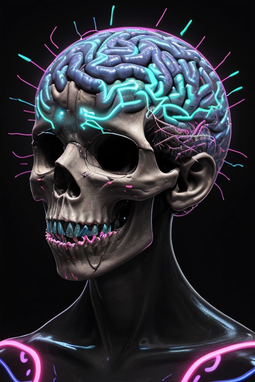 A man drowning inside his own mind. FRONT VIEW. Subliminal messaging, Horror, neon-colored brain scan aesthetic on black background. the figure of a skull is seen inside the brain scan. Psychedelic brain scan. Horror, Vibrant, glowing neural pathways Abstract, futuristic aesthetic. Style mimics bioluminescence art. Sharp contrast between vivid colors and deep black background. realistic rendering of brain lobe. Conveys sense of brain death, cognitive decline, and mental degradation. Sharp jagged teeth. Horror theme.