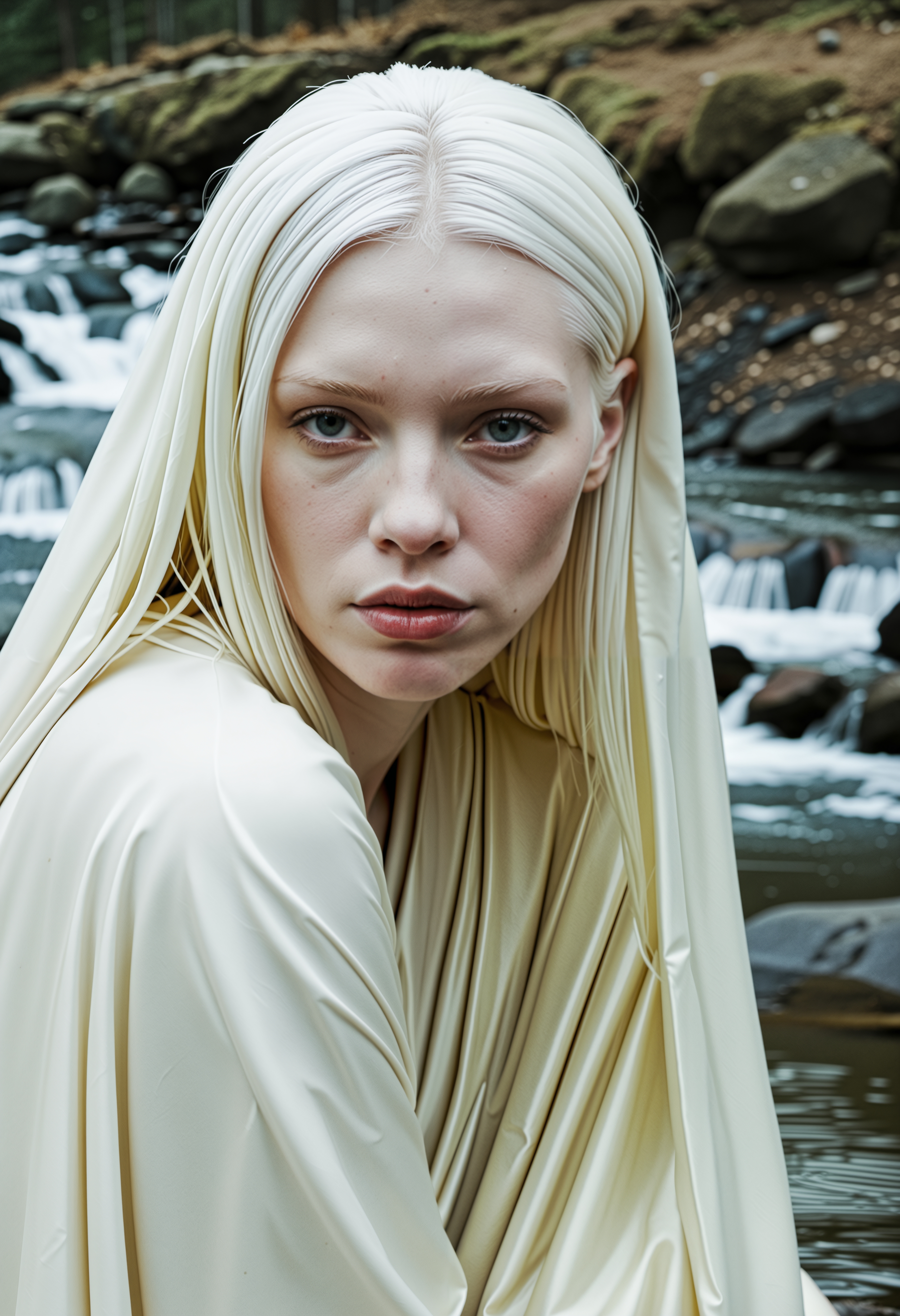 close up analogue photo of a beautiful 25 years (((albino woman:1.5))) with white hair (((pale skin:1.5))), white hair, <lora:Lumiya_SDXL:0.6>, A woman kneels at the edge of a mountain stream, face reflected in water, robes of earth-toned silk trailing into the current, painterly brushwork and natural light.