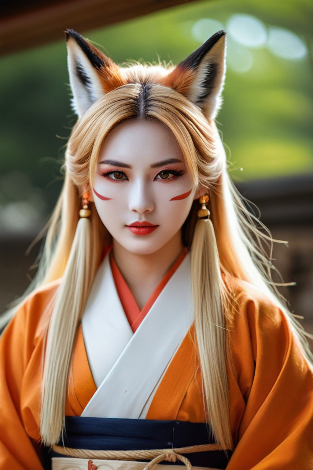 rating_safe, breathtaking detailed, masterpiece, absurdres, awe-inspiring, best quality, vibrant colors, muromachi86, kitsune, fox girl, facial mark, animal ears, japanese clothes, blurry background, 1girl, long hair, blurry, solo, kimono, brown eyes, facepaint, realistic, fox ears, white kimono, earrings, jewelry, upper body, looking at viewer, lips, forehead mark, nose, long sleeves, blonde hair, depth of field, rope, animal ear fluff<lora:sdxl_muromachi86.safetensors:0.8:0.8>