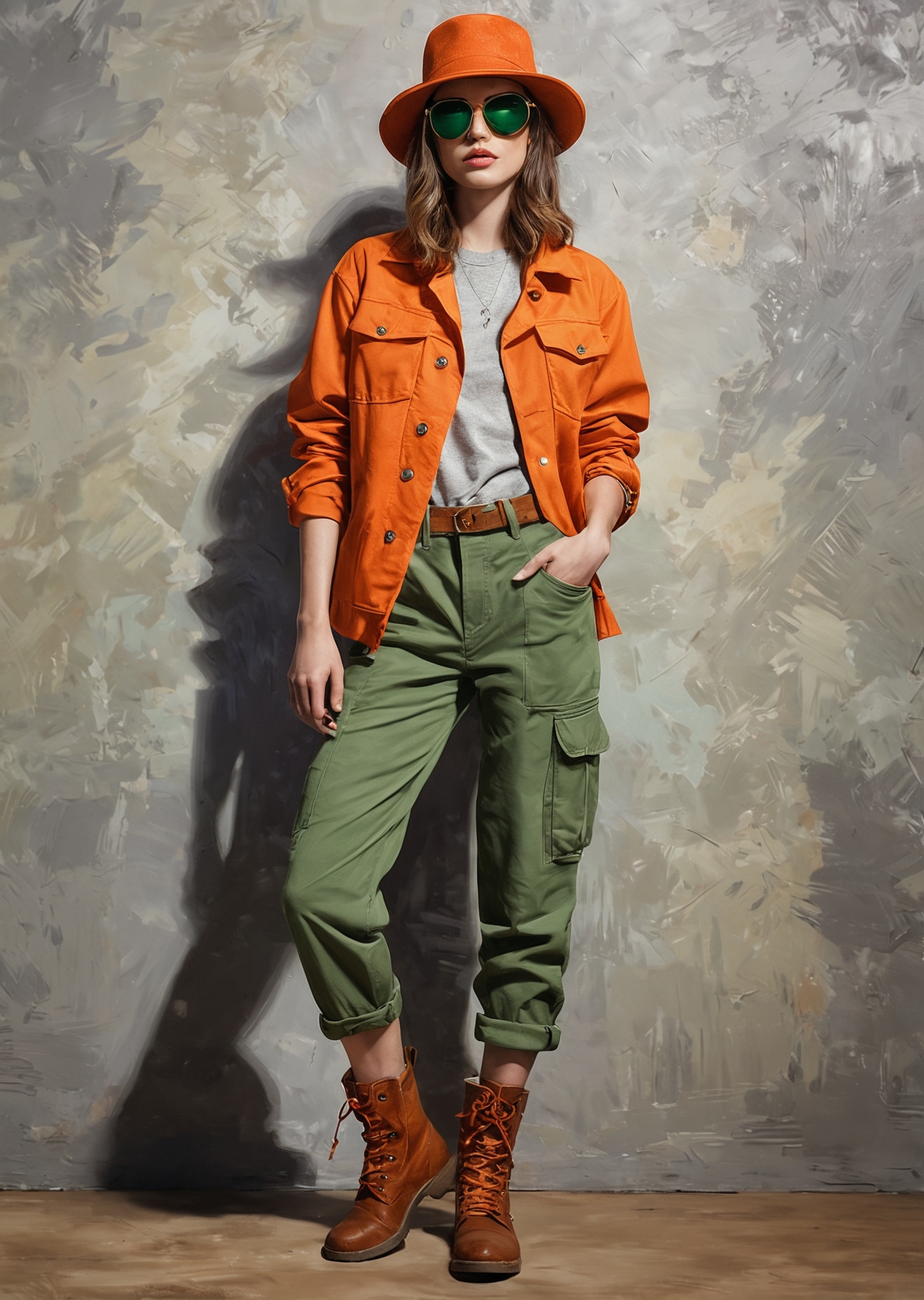 Create a detailed digital illustration in the style of an oil painting, featuring a young woman standing confidently against a warm, textured background with a glowing sun. She wears a wide-brimmed hat with goggles, a loose red jacket over a gray t-shirt, and two-tone cargo pa.nts - one leg orange, the other green - paired with high-top boots with orange laces. Use slightly rough texture and dramatic lighting to highlight the folds of her clothing and the details of her accessories. The colors should be rich and saturated, creating a vivid, dynamic atmosphere. Keep the background minimal and neutral to emphasize the bold and adventurous mood —ar 3:4 —s 1000 —style raw —v 7 <lora:Dorota_2:1> Dorotanima style <lora:test2:1> nistyle