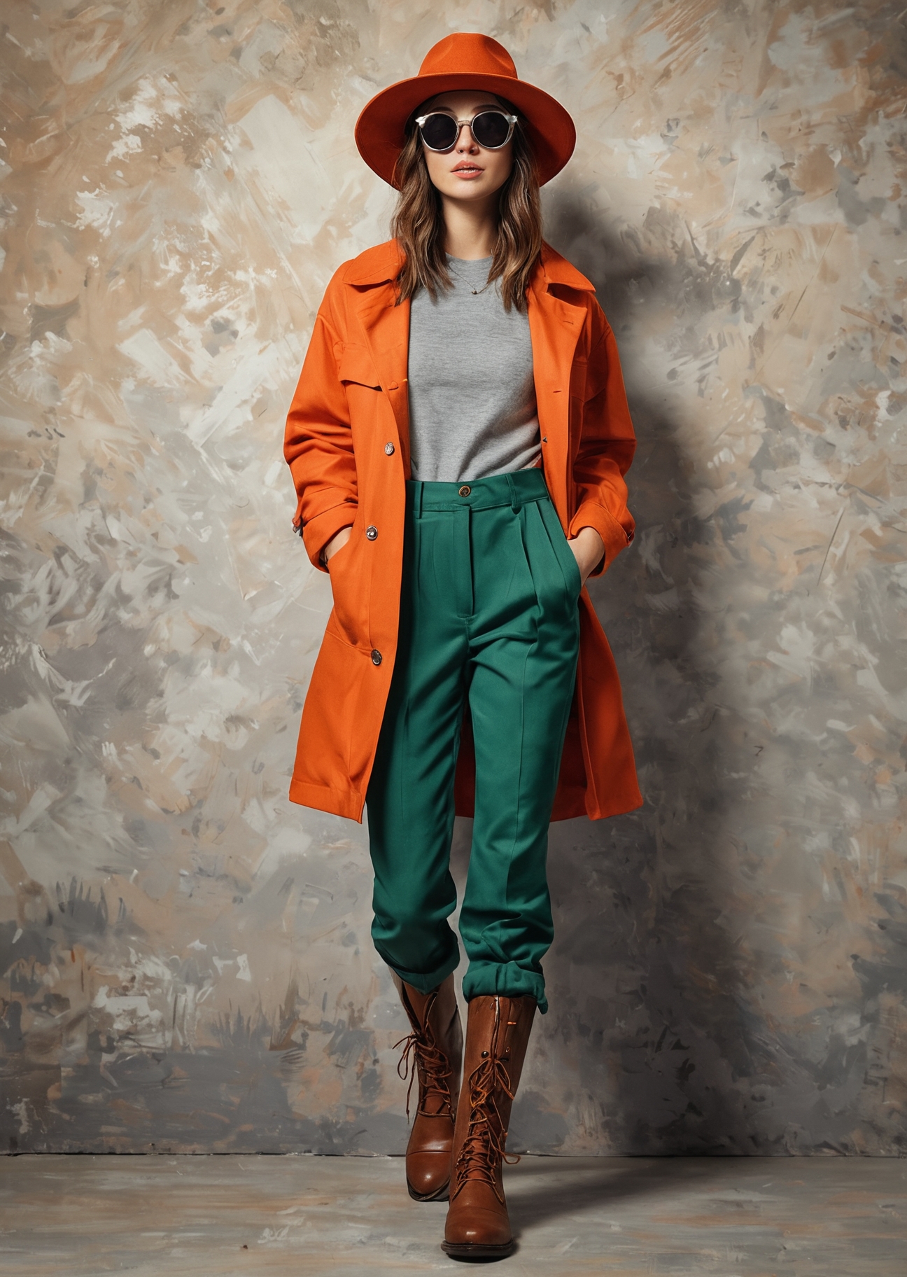 Create a detailed digital illustration in the style of an oil painting, featuring a young woman standing confidently against a warm, textured background with a glowing sun. She wears a wide-brimmed hat with goggles, a loose red jacket over a gray t-shirt, and two-tone cargo pa.nts - one leg orange, the other green - paired with high-top boots with orange laces. Use slightly rough texture and dramatic lighting to highlight the folds of her clothing and the details of her accessories. The colors should be rich and saturated, creating a vivid, dynamic atmosphere. Keep the background minimal and neutral to emphasize the bold and adventurous mood —ar 3:4 —s 1000 —style raw —v 7 <lora:Dorota_2:1> Dorotanima style <lora:Phandigrams:1> By Phandigrams <lora:Phandigrams_II:1> By Phandigrams