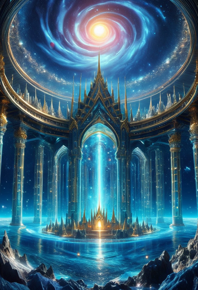CosmicStyle A glowing celestial temple floating above a swirling cosmic ocean under a fragmented polychrome moon, inhabited by translucent electrum nymphs performing an ancient ritual, divine beams of light pulsing through their bodies, vivid starlight refracted in pools of liquified gravity, ultra-detailed, cosmic-style, 3D-rendering, dreamlike, Unreal Engine, absurdres