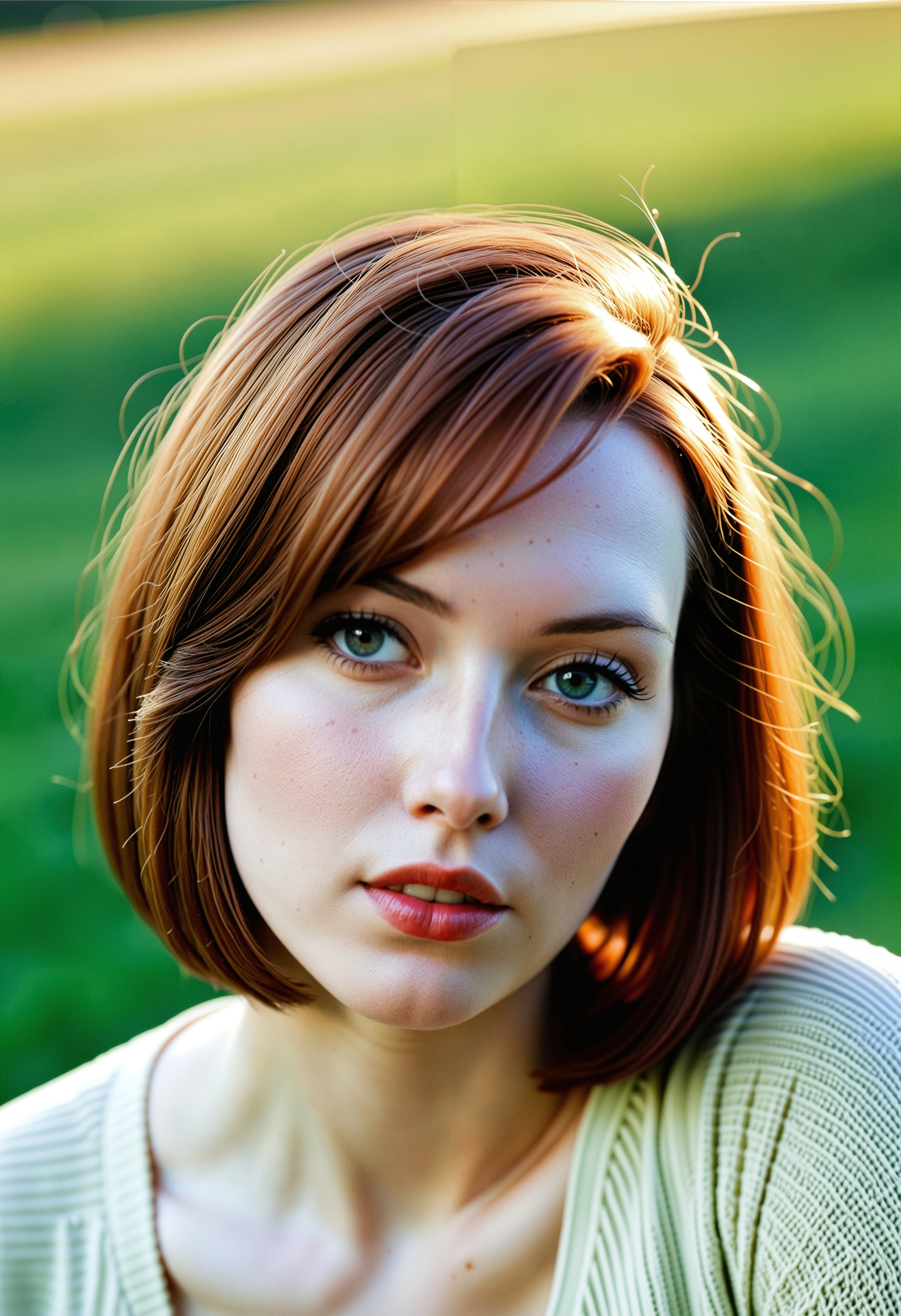 (Close up analogue photo) of a beautiful 25 years ((pale skin)), oval face, auburn haired woman, <lora:Jacinta_SDXL:0.7>,wearing Mermaidcore, ((cute-bob-haircut:1.5)),,low light, soft natural light, Rembrandt style light, Hasselblad DLSR camera, 200mm Zeiss lens, f/2.8, ,Sexy pose, erotic pose, exhibitionism ,A peaceful countryside with rolling hills and grazing sheep