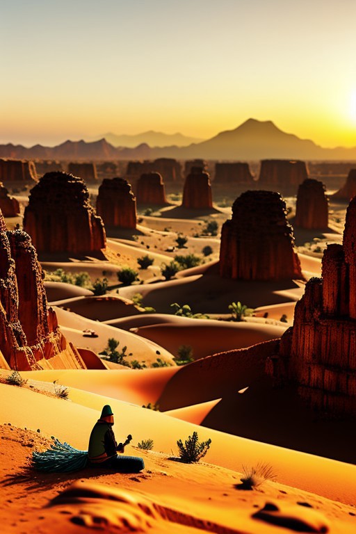 Cartoon Warrior on Cliff Overlooking Real Fantasy Desert City A cartoon hooded figure stands at the edge of a real, photorealistic desert canyon city—massive domes, spires, and crumbling towers stretch beyond. The warrior’s tattered cloak flutters in warm golden-hour breeze. Ships lie stranded in sandbeds below. The cartoon contrasts beautifully with the sweeping ultra-real panorama. Tiny palm oases glimmer with cartoonish sparkles, blending epic scale with quiet charm.
