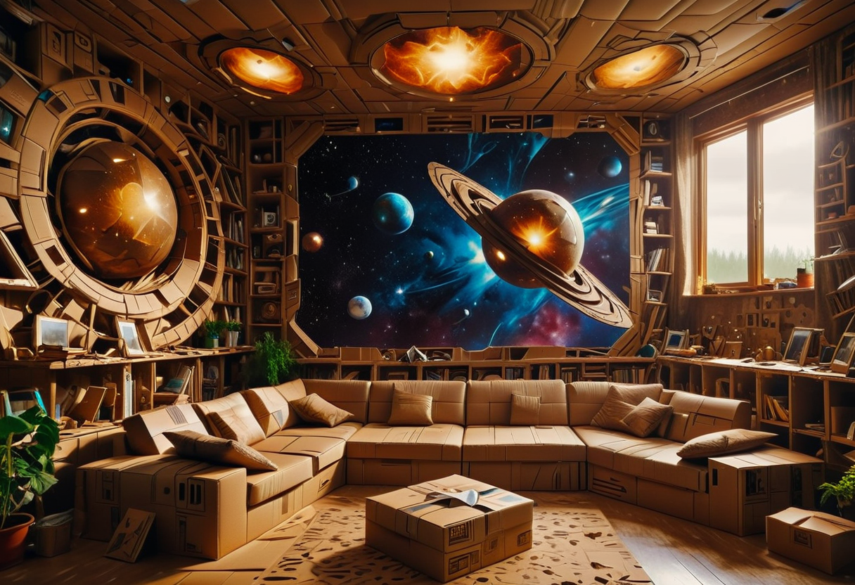 SDXL_POS, CardboardRay, cosmos made of cardboard, in fantastic realism style, overhead shot, medium close-up, on a sectional, overcast, afternoon <lora:CardboardRay:1.3> <lora:SDXLFaeTastic2400:1.0>
