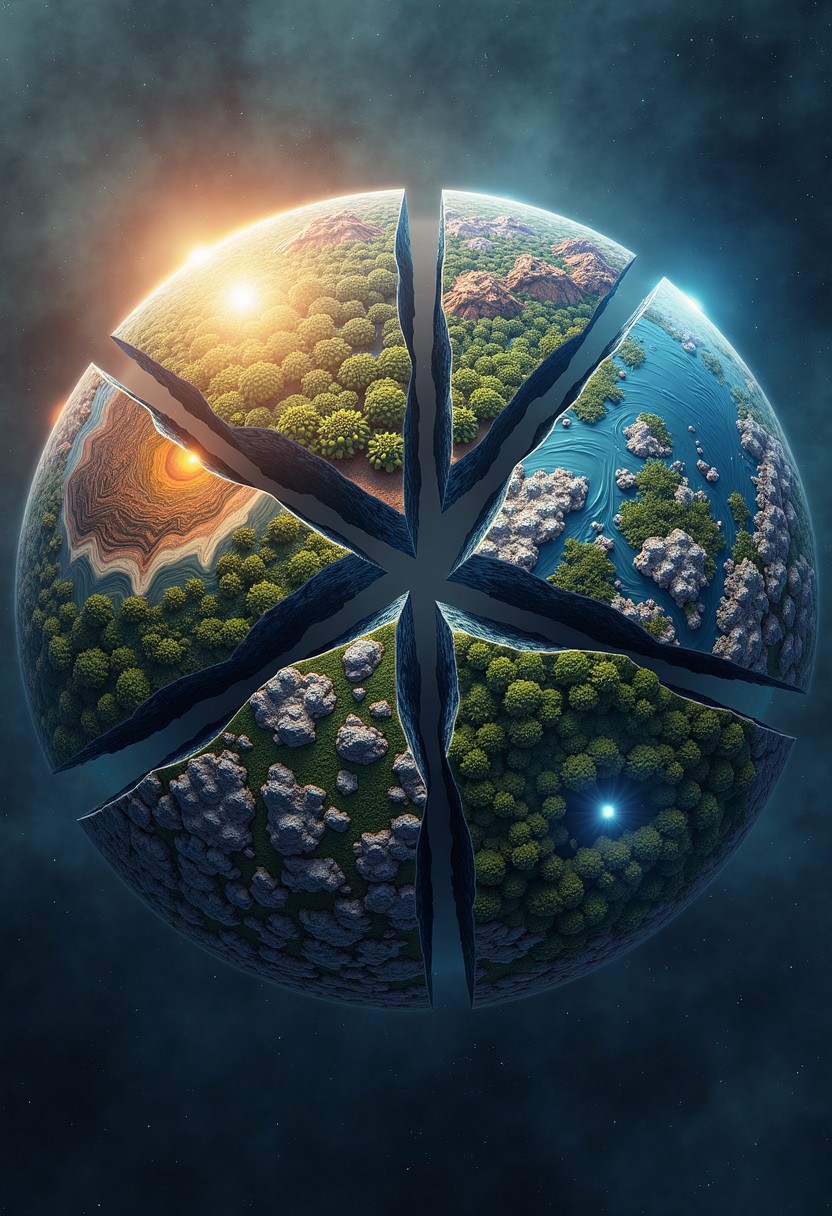 masterpiece, cinematic, ultra-detailed, realistic digital art, shattered planet divided clearly into twelve distinct biome fragments, each fragment representing a unique biome: dense rainforest, icy tundra, arid desert, lush grasslands, volcanic wasteland, deep ocean, floating islands, mystical forest, rocky mountains, luminous crystal caves, urban futuristic cityscape, ethereal astral realm, visually cohesive symbolic formation, vibrant colors, intricate details, glowing edges, symbolic design, cosmic background, trending on artstation, high contrast, high resolution 4K, cinematic lighting