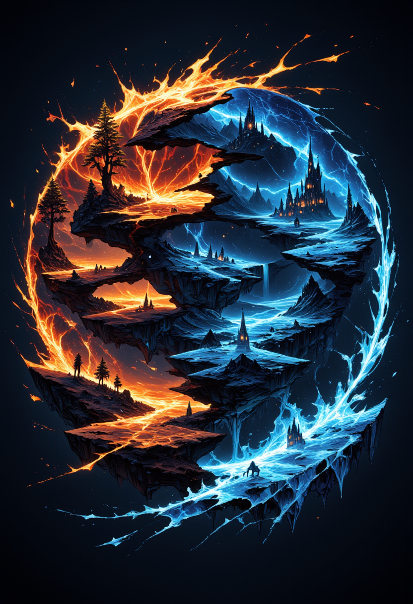 Create an image split into 5 shattered fragments, like pieces of a broken mirror, each depicting a different world. The first fragment shows a fiery desert, with blackened rocks and swirling ash storms. The second fragment reveals an enchanted forest, where glowing bioluminescent trees tower over the misty ground. The third fragment is an underwater city, ancient and ghostly, with glowing seaweed and crumbling structures. The fourth fragment portrays a post-apocalyptic wasteland, with ruined cities and mutated creatures lurking in the dust. The fifth fragment is a frozen wasteland, with jagged ice mountains and eerie northern lights illuminating the cold, empty space. Each piece should feel connected by glowing cracks or magical energy, with contrasting color schemes for each world.