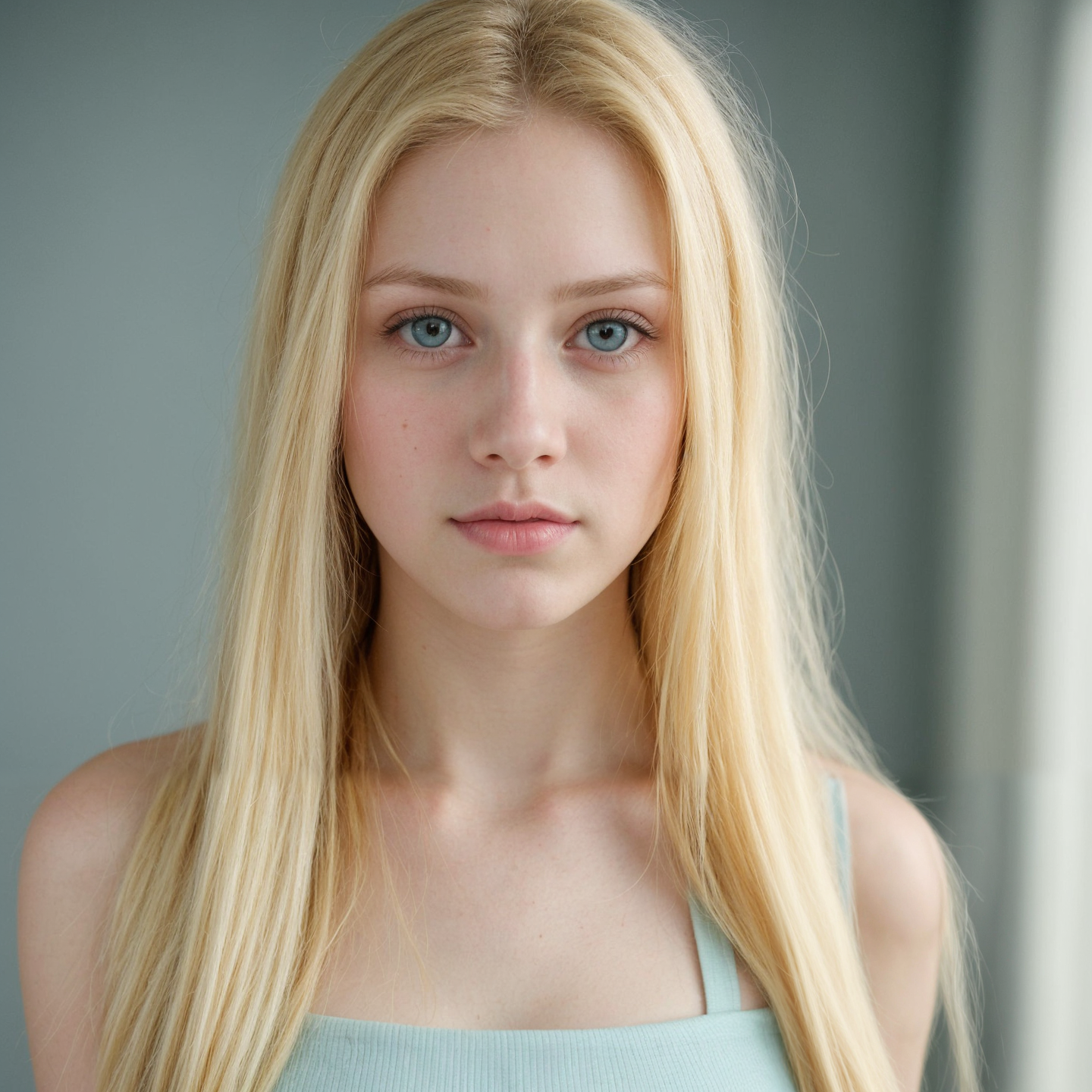 The image features a young woman with fair skin and light blue eyes. She has long, straight blonde hair that falls just above her shoulders. Her gaze is directed slightly off-camera to the right. The background is a soft, blurred beige color, providing little contrast to her face, which accentuates the details of her expression and features. There are no visible texts or brands in the image.