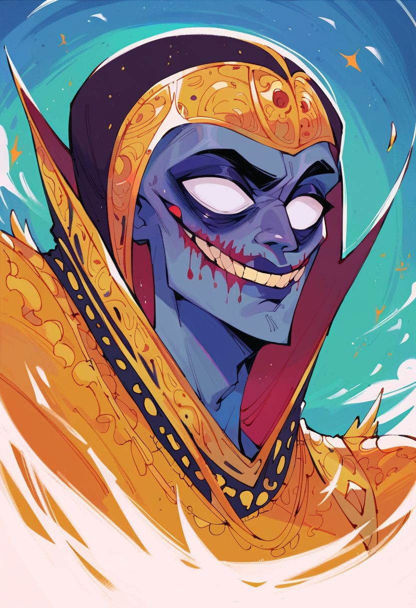score_9, score_8_up, score_7_up, strange man, beautiful full beard, big eyes, dark blue skin, white eyes, golden jewelry, a belt of skulls, a necklace of severed bloody heads,( inhumanly thin:1.1) exaggerated, skinny, dutch angle,