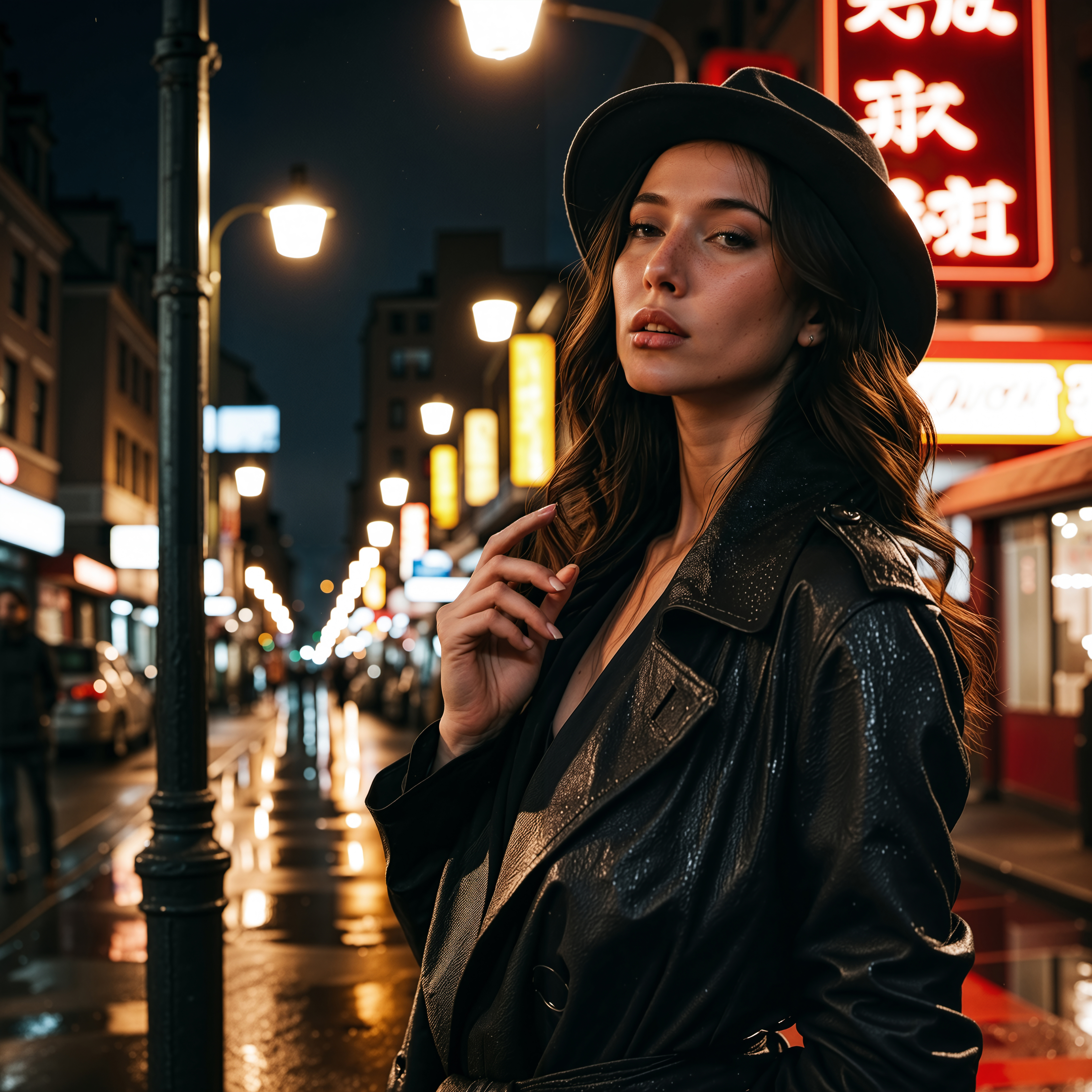 RAW analogue photo of a beautiful 25 years old woman, clear focus, high resolution image, ,Rainy Night Noir Detective A trench-coated woman leans against a rain-slicked lamppost, lighting a cigarette. She surveys a shadowy alley lined with flickering neon signs. High-contrast light from the sign casts deep angular shadows across her face and fedora. Cinematic crop from waist up., Beauty, Realistic, Hot, Realistic_Beauty, ,high quality, film grain, Fujifilm XT3, 8k uhd, dslr, film grain, kodak tri-x 400 film, grain photo DOF, faint lighting, dynamic angle, cinematic, Depth of field, bokeh, best quality, cinematic, light particles, highly_detailed, very_aesthetic, golden hour, beautiful_and_aesthetic ,Sexy pose, erotic pose, exhibitionism, ,holographic city