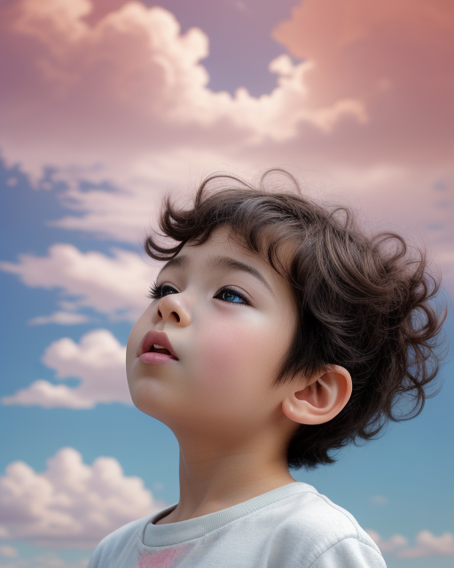 Cute child (ethnicity:1.1), (age:2), (detailed clothing:1.1), (expression:surprised), (facial features:1.2), looking upward, mouth wide open, curly dark hair, large expressive eyes (detailed eye makeup:1.2), (body type:1.1), (pose:1.2), wearing light pink shirt with colorful designs; sky background with soft pastel colors (light blue, pale pink, light peach), fluffy clouds; composition centered on the child; soft lighting, style anime/manga illustration, photo style, high detail digital painting; child centered in the frame, facing upward, full shot, soft focus on eyes and facial expressions.
