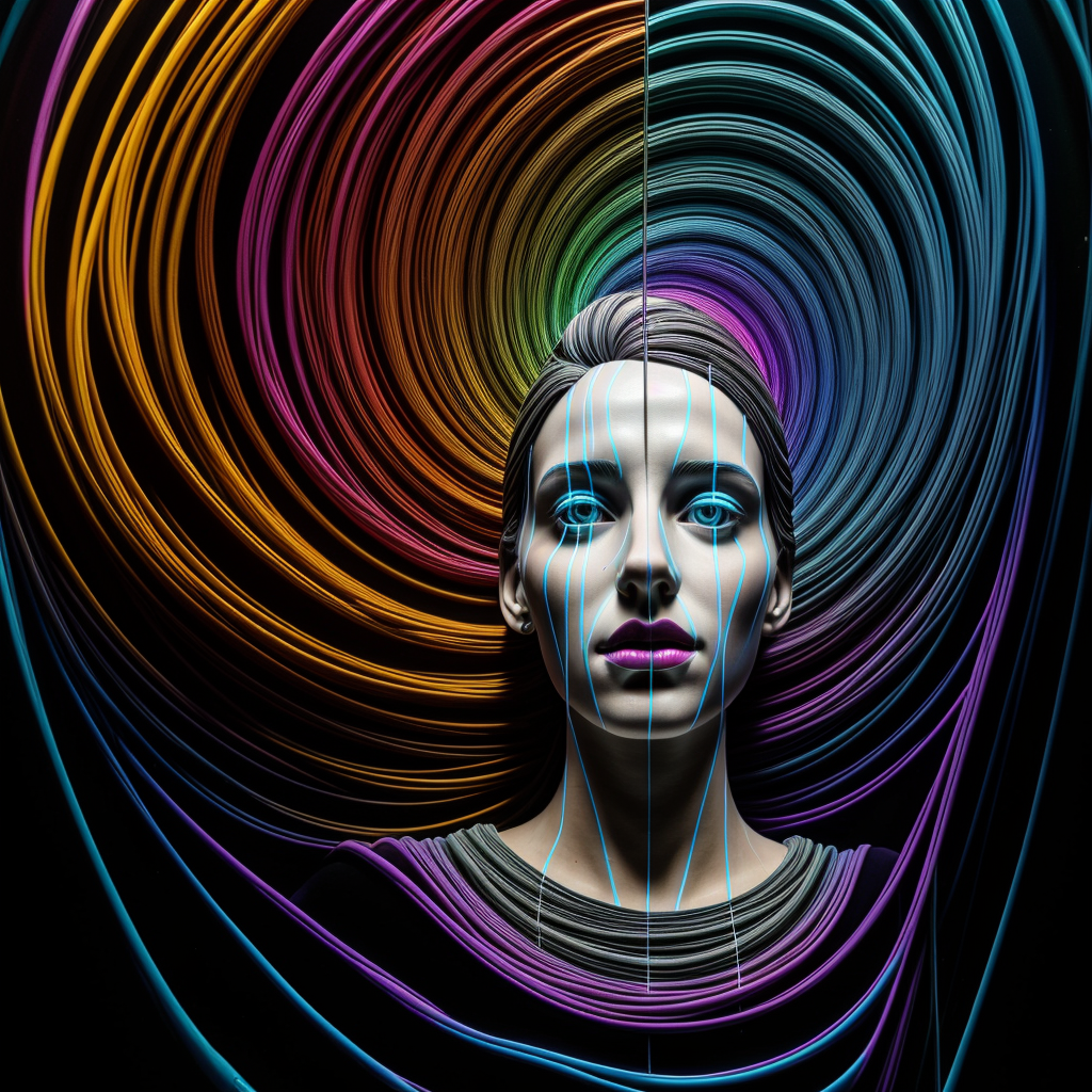 highly detailed, hyper realistic, masterpiece, perfect quality, best quality, BREAK an image split down the middle, an exquisite sculpture, marble and ebony, concentric faces, a living embryo at the center connected to the grid, laser prism spectrum gradient, neon dripping smoke, puddles, melting, glitched style, matrix, dissolve, psychedelic, beyond belief, biomorphic, supernatural, alien, BREAK