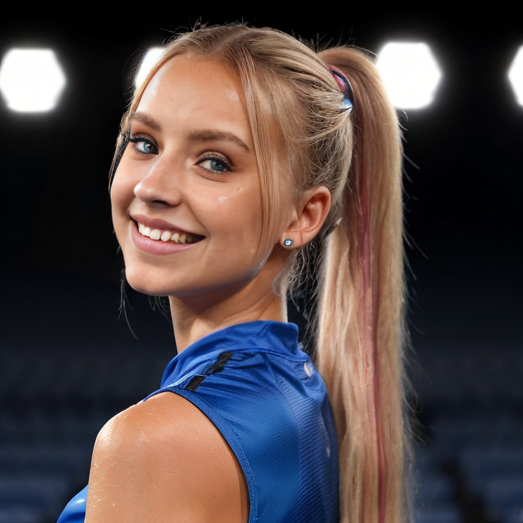 ultra realistic cute tanned girl with vivid blue eyes and medium boobs, long and high blonde hair ponytail, cinematic lighting, expressive style, vivid and colorful, ultra detail