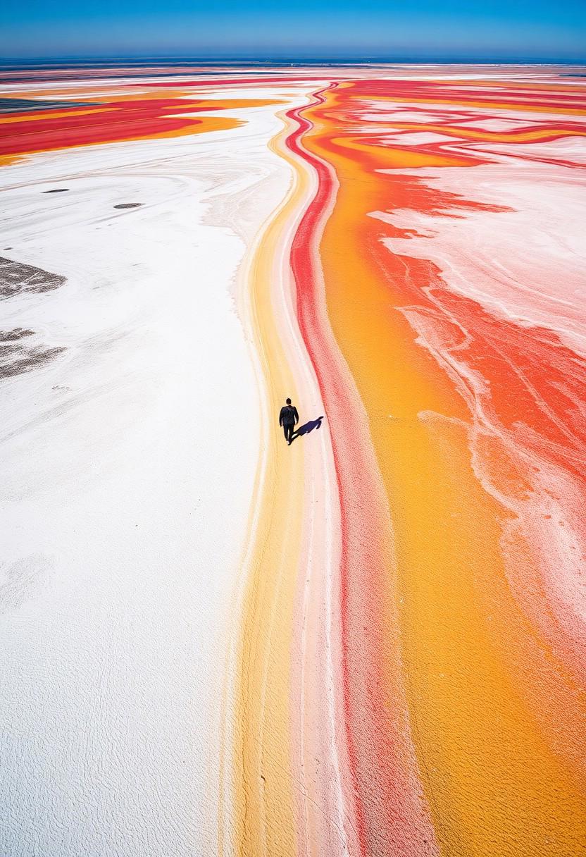 Aerial View of Person on Colorful Path Aerial view of a person walking on a path dividing white and colorful landscapes, creating a striking visual contrast.