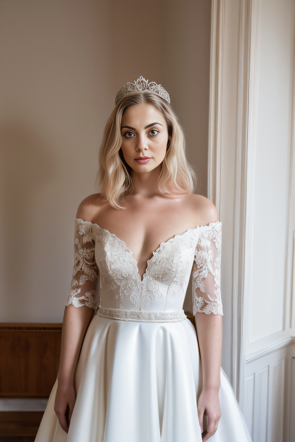 30yo beautiful woman, high quality, best quality, highres, high detail platinum blonde hair, (haute couture), wedding ballgown, white dress, short sleeves, standing, cleavage, tiara, (cathedral, ornate), ((rim lighting)) (shadows) hand on hip,, ((30yo curvy woman)). RAW, UHD, 8K, perfect hands