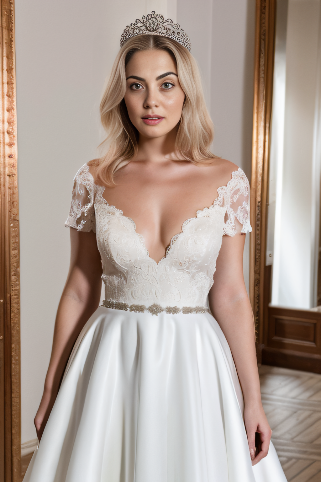 30yo beautiful woman, high quality, best quality, highres, high detail platinum blonde hair, (haute couture), wedding ballgown, white dress, short sleeves, standing, cleavage, tiara, (cathedral, ornate), ((rim lighting)) (shadows) hand on hip,, ((30yo curvy woman)). RAW, UHD, 8K, perfect hands