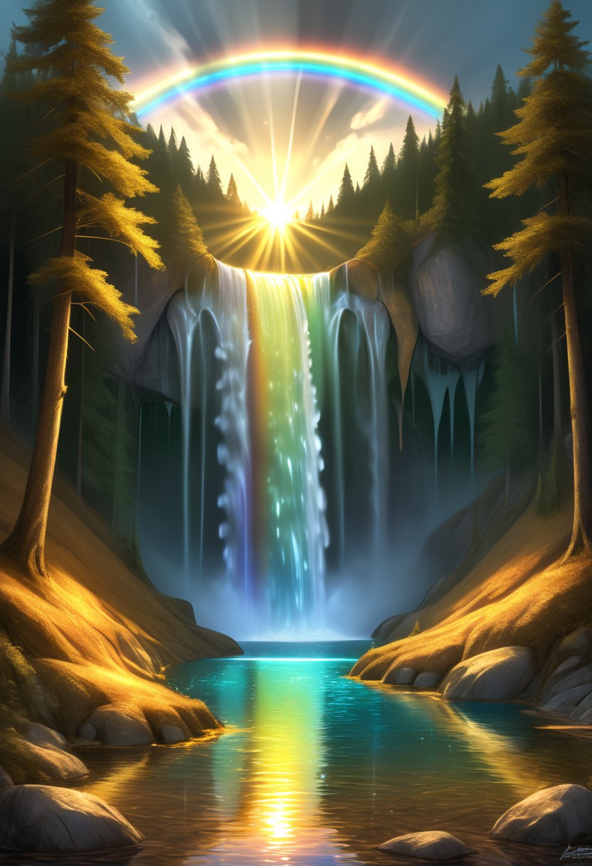 aesthetic, masterpiece, beautiful, elegant, award winning, absurdres, hdr, best quality, hyper detailed, (waterfall:1.5) iridescent, forest, (gold colour lake:1.3), lake, shiny, sparkle, symmetrical, glowing, rainbow