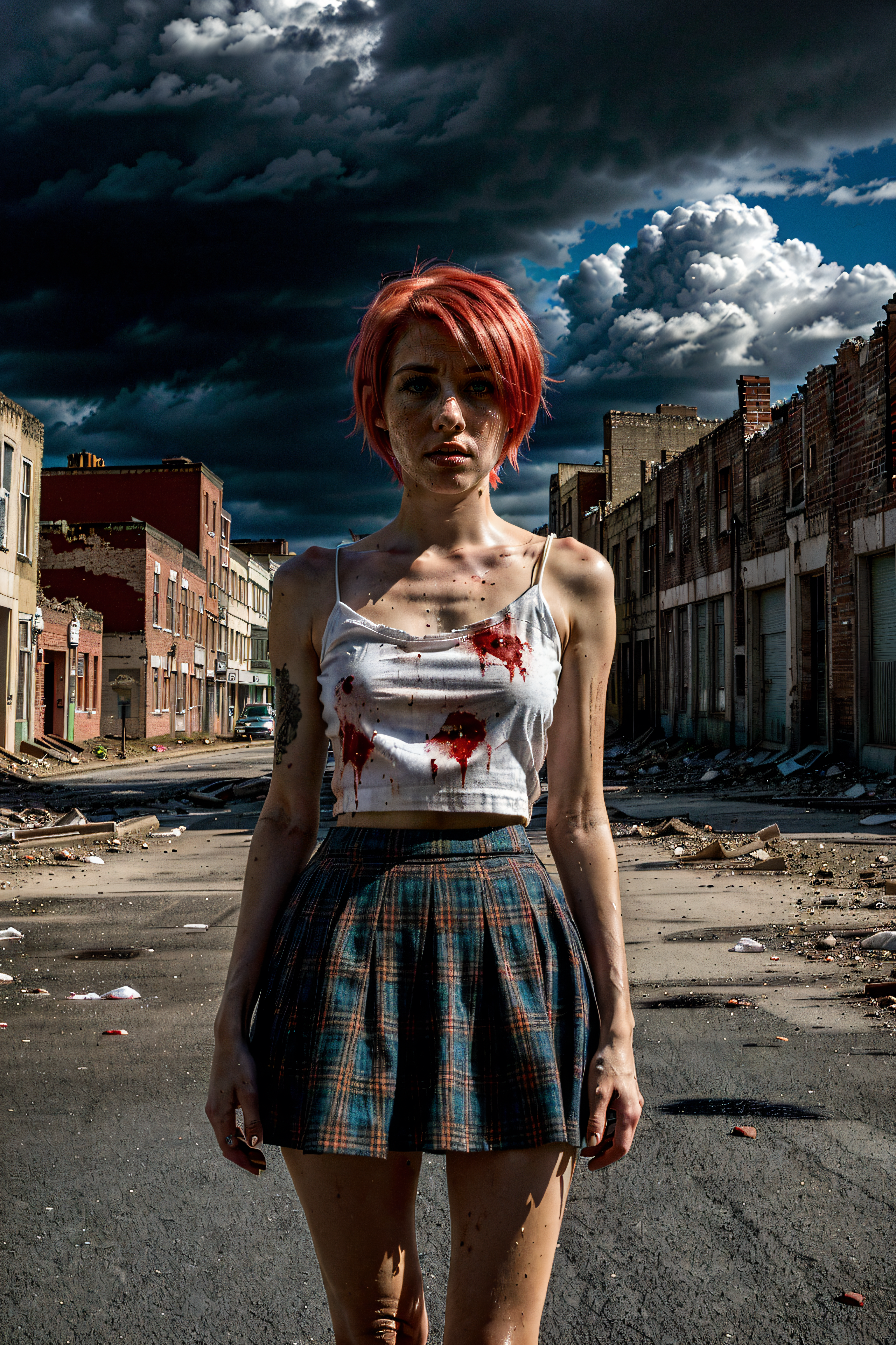 detailed, high quality, 1woman, mature, short pink hair, perfect hand, bleeding, white camisole, blue plaid skirt, clouds, gloomy abandoned street, post-apoc <lora:blood:-0.2> <lora:hairdetailer:0.7> <lora:ApocalypseEngine2:0.4> <lora:abandoned_style:0.4> <lora:DetailTweakerLora:0> <lora:Hand v3 SD1.5:0.8>