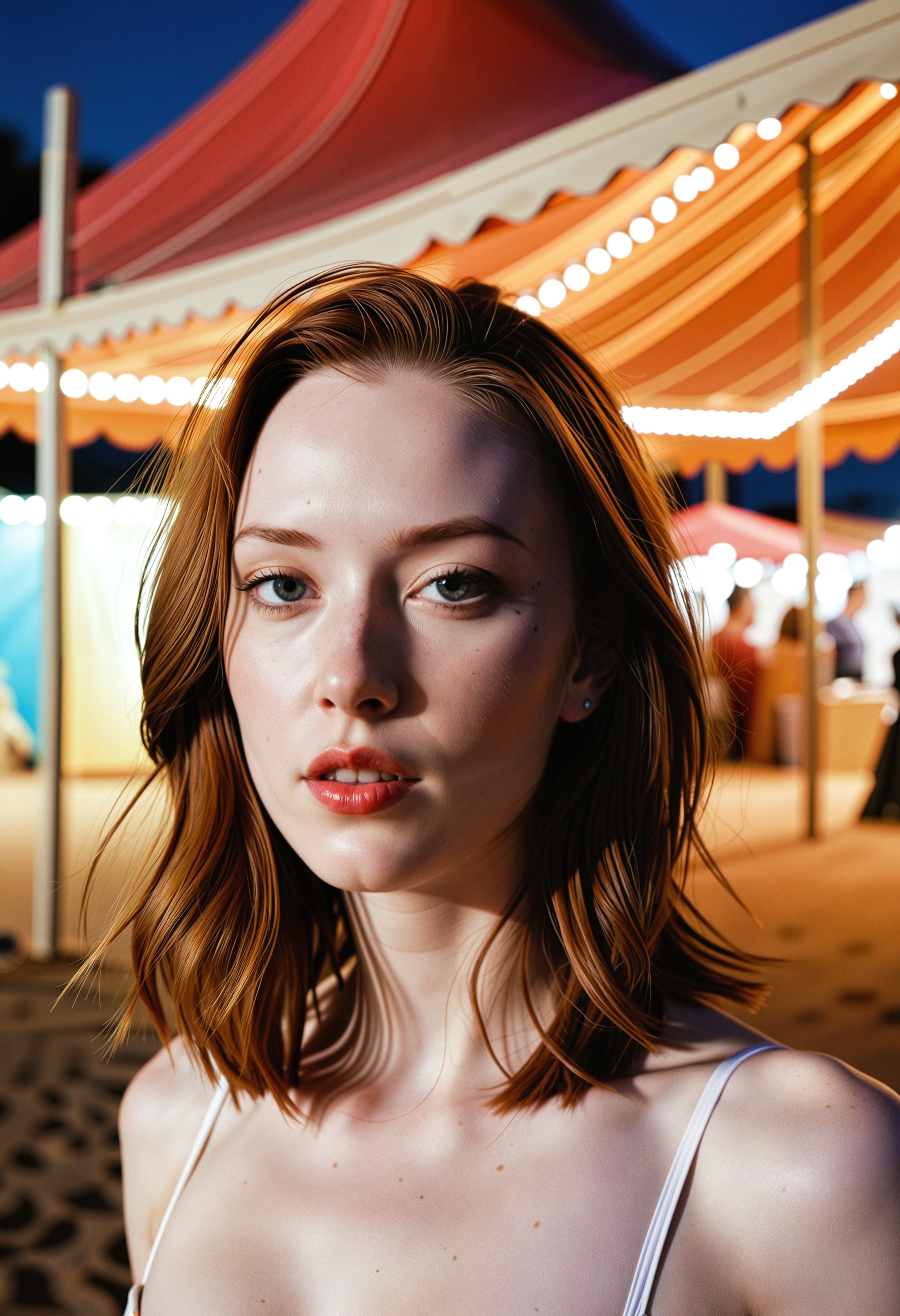 (Close up analogue photo) of a beautiful 25 years ((pale skin)), oval face, auburn haired woman, <lora:Jacinta_SDXL:0.7>,wearing Hallyu, (shoulder length hair:1.3),,low light, soft natural light, Rembrandt style light, Hasselblad DLSR camera, 200mm Zeiss lens, f/2.8 ,Sexy pose, erotic pose, exhibitionism ,desert oasis marketplace with holographic projections and colorful tents