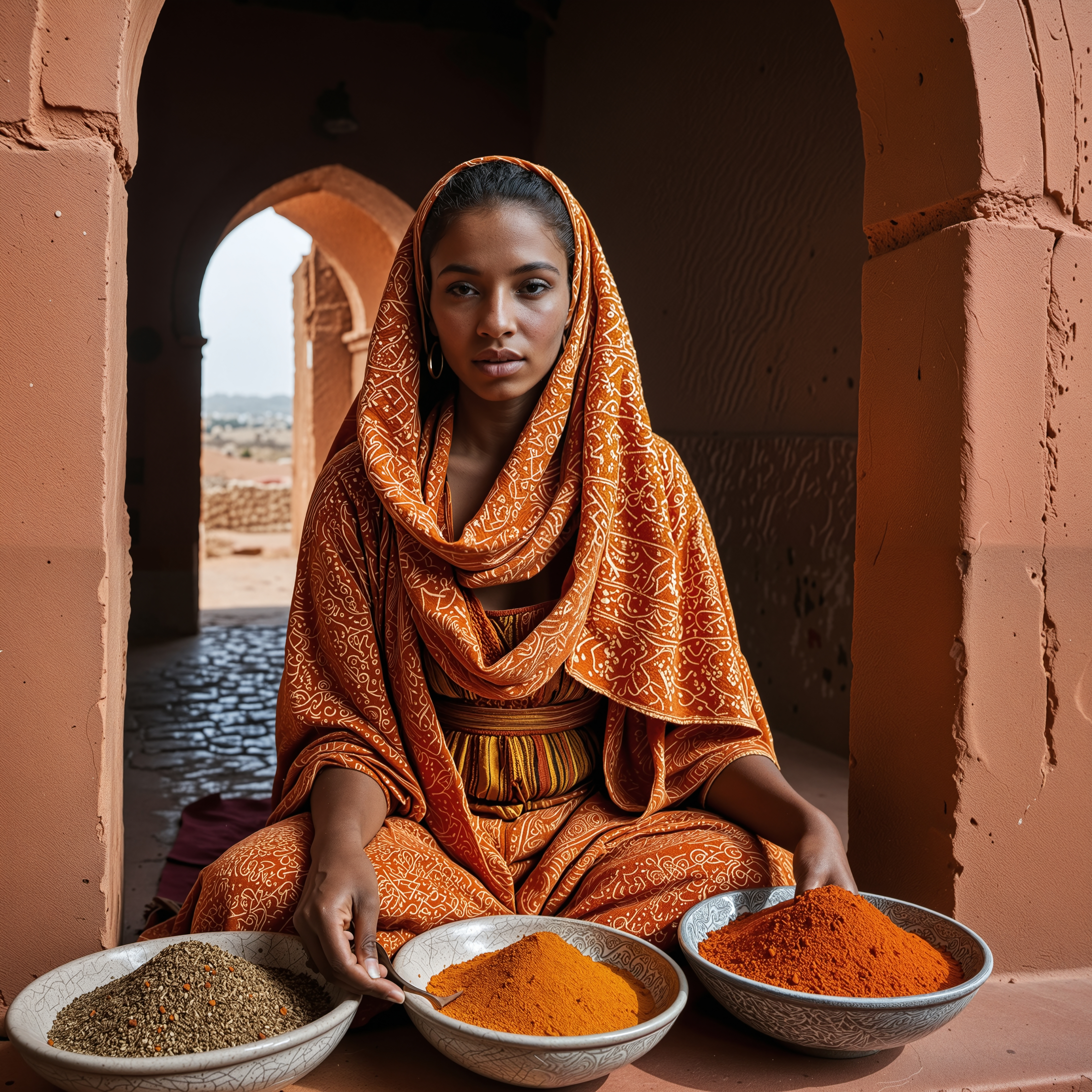 RAW analogue photo of a beautiful 25 years old woman, clear focus, high resolution image, ,African woman, clear focus, 8K, Alexa,<lora:Alexa_OC:0.6>, ,Moroccan Spice Seller in Fez Medina Clad in a djellaba and patterned scarf, she arranges spices in conical baskets under a mosaic archway. Shafts of dusty light catch motes above saffron, cumin, and paprika mounds. Ground-level angle centered on color and geometry., Beauty, Realistic, Hot, Realistic_Beauty, ,photo Fantasy art combining the styles of Boris Vellejo and Luis Royo, Photorealistic, real photo, god rays, 1girl, 21yo,realistic, ,Sexy pose, erotic pose, exhibitionism, ,A peaceful farm with barns and grazing animals