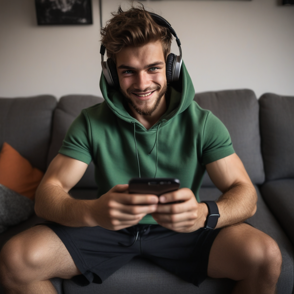 holding phone, photo background, arm hair, green eyes, hoodie, upper body, closed mouth, blurry background, young male, foot focus, solo, headphones, pose, hood, black shorts, feet, standing, sitting, couch, smile, beard, flexing