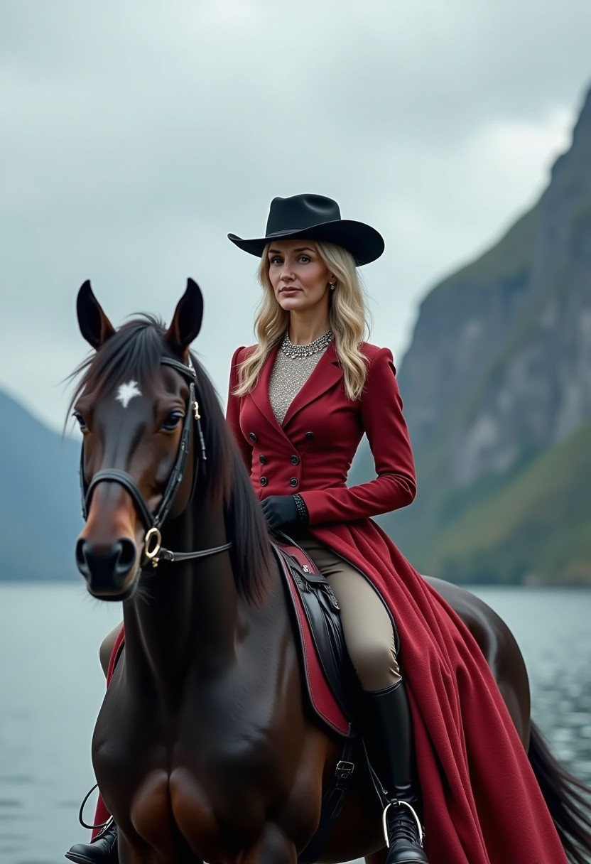 masterpiece, absurdres, high quality, beautiful 4str1df0xx dressed in a fashionable riding outfit, riding on a black Clydesdale horse next to a norwegian fjord, ultra-detailed, colorful, photo realistic, 4k, Fantastic lighting. Detailed shadows, vivid colors, ultra-sharp, award-winning, The style is realistic with a touch of surrealism, dreamy atmosphere