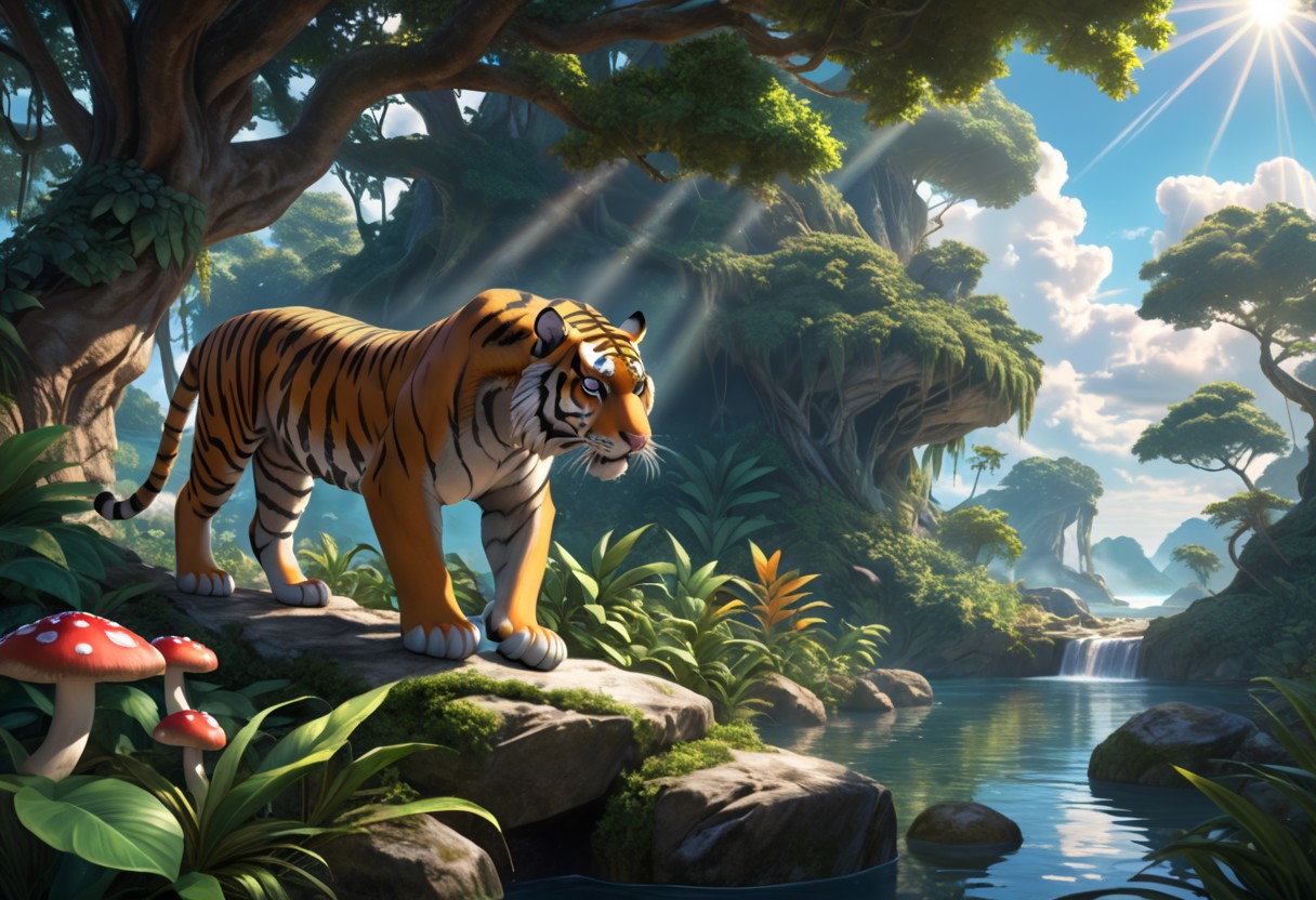 tiger stalking its prey in the jungle, plant, shrub, tree, leaves, mushroom, water, sunrays, shadows, sky, horizon, rock, cloud,, masterpiece, 8k, ultra high res, ultra high detail, best quality, ultra detailed, realistic, opulent scenery, complex scene, explicit, vibrant colors,