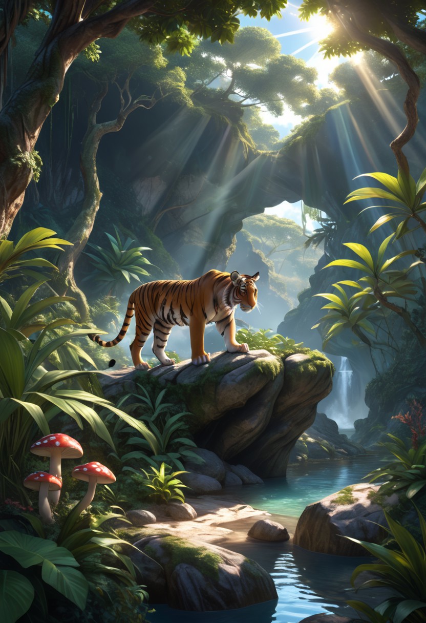 tiger stalking its prey in the jungle, plant, shrub, tree, leaves, mushroom, water, sunrays, shadows, sky, horizon, rock, cloud,, masterpiece, 8k, ultra high res, ultra high detail, best quality, ultra detailed, realistic, opulent scenery, complex scene, explicit, vibrant colors,