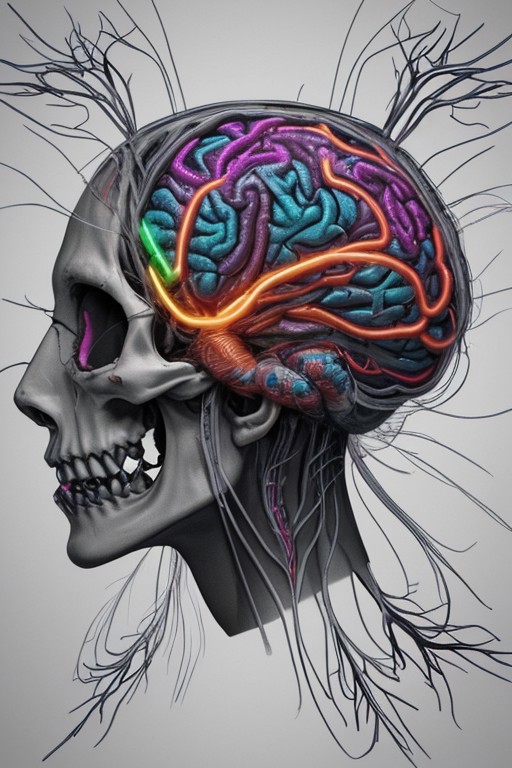 A man drowning inside his own mind. FRONT VIEW. Subliminal messaging, Horror, neon-colored brain scan aesthetic on white background. the figure of a skull is seen inside the brain scan. Psychedelic brain scan. Horror, Vibrant, glowing neural pathways Abstract, futuristic aesthetic. Style mimics bioluminescence art. Sharp contrast between vivid colors and deep black background. realistic rendering of brain lobe. Conveys sense of brain death, cognitive decline, and mental degradation. Sharp jagged teeth. Horror theme.