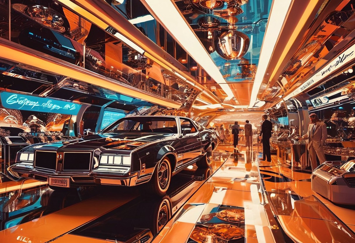 ((70's retrofutursim with Syd Mead art style)), Enter a realm where science fiction meets the disco era, reminiscent of 70's retrofuturism. Immerse yourself in a retro-futuristic metropolis, filled with holographic billboards, futuristic fashion, and advanced technology. The scene is brought to life with the artistry of Syd Mead, capturing the essence of an era that never was.