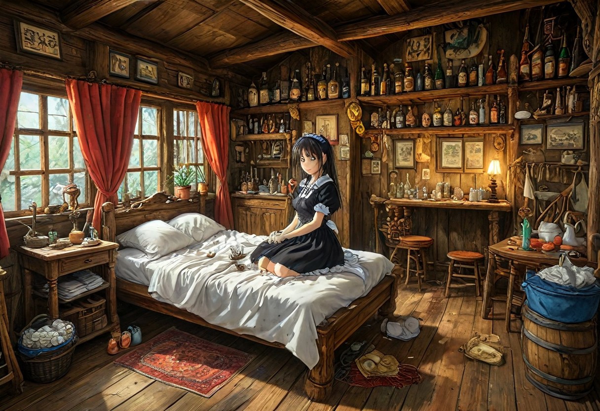 score_9, score_8_up, score_7_up, score_6_up, Masterpiece, source_anime screenshot, 1 girl, vivid colors, full color, shiny and glossy, anime style, high-res, beautiful aesthetic, very intricate, high-quality , vibrant, , award-winning, professional,(Isekai anime style.Anime coloring.(0.9))That Fantasy role playing game Inn's / tavern's one bed room we all sometimes use.Complete with a maid tending to the cleanliness thereof.
