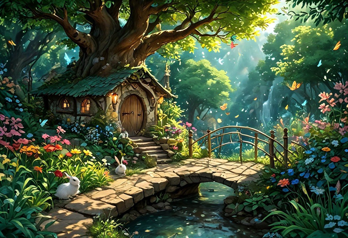 score_9, score_8_up, score_7_up, score_6_up, Masterpiece, source_anime screenshot, 1 girl, vivid colors, full color, shiny and glossy, anime style, high-res, beautiful aesthetic, very intricate, high-quality details, vibrant, highly detailed, award-winning, professional,(Isekai anime style.Anime coloring.(0.9))In a whimsical world, a beautiful fairy garden blooms with vibrant flowers and sparkling fountains. A delicate, crystal bridge spans a gentle stream, leading to a majestic tree with leaves that shimmer like diamonds. A friendly, fluffy rabbit hops along the winding path, surrounded by fluttering butterflies and sweet, singing birds. The garden is filled with hidden treasures, like a tiny, glowing fairy door and a secret, shimmering cave. A soft, fluffy cloud drifts lazily across the sky, casting a warm, gentle shadow over the garden. The air is filled with the sweet scent of blooming flowers and the soft, soothing sound of gentle chimes. It's a peaceful, magical place where dreams come alive and wonder waits around every corner.master_class,master_piece,up_8,up_9,perfect beautiful,perfect beautiful early morning light.