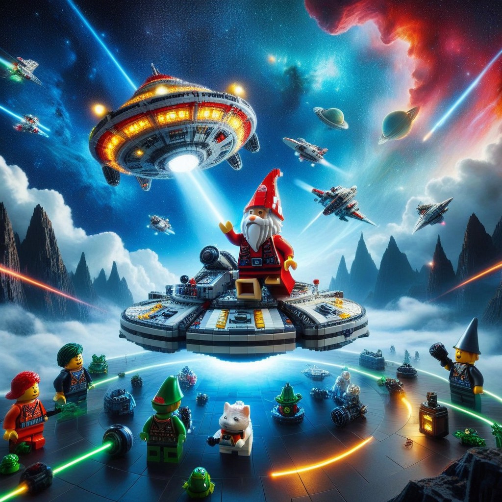 Whimsical Cartoon into Real Photo Backgrounds, Pixel Art, PixArFK, made of legos, score_9, score_8_up, score_7_up, score_6_up, score_5_up, score_4_up, masterpiece best quality, excellent countershading, detailed lighting, depth of field, dynamic angle, close up, oil painting BREAK a whimsical gnome riding a Shiba Inu flying saucer with its mouth open charging a laser beam, funny, realistic, photograph, shiny, rabbit, bear, frog, BREAK star cluster,space stars,clouds,stars,nebula,space art, deep space, cyberpunk space station, sci-fi space station, outer space, stars, planets, nebula, galaxies, the Milky Way, space station, massive space station, space shuttle, PixArFK
