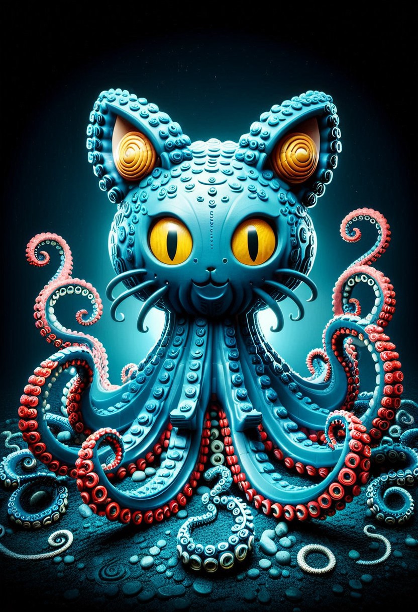 cs-l3ath3r, cs-l3ath3r, octocat, a mythical creature with the head of a cat and the body of an octopus, (cat head:1,6), whiskers, (cat ears:1.5), (inner fluff ears:1.3), (cat eyes:1.5), tentacles, eight tentacles, twisting tentacles, swirling tentacles, dark background, deep sea background